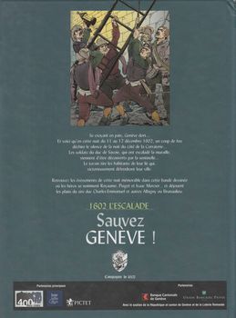 remarques: | titre complet: sauvez Genève, 1602 l'Escalade, album édité par la Compagnie de 1602 à Genève la nuit de samedi 11-12.12.1602, Dieu était du côté des genevois >> p. 4/5 vue de Genève en 1602 malgré des promesses de paix avec la Savoie, Genève est avertie d'une attaque savoyarde imminente sur Genève, mais le chef de la milice ne s'en préoccupe guère, l'assaut savoyard dirigé par le comte Charles d'Albigny est bien préparé et prévu de nuit à 2 heures du matin, Charles-Emmanuel Ier de Savoie veut faire de Genève sa capitale et rendre à la foi catholique le foyer de l'hérésie protestante >> p. 12 il accorde à ses soldats le droit de pillage sur Genève deux agents genevois découvrent le plan des savoyards, l'un réussit à partir avertir les bernois, alliés de Genève, mais l'autre, parti aussi pour avertir Genève est arrêté par les savoyards >> p. 16/17 l'assaut commence comme prévu en silence par 300 savoyards d'élite en escaladant avec des échelles les remparts de la Corraterie avec le but d'ouvrir la porte Neuve pour laisser entrer le gros des troupes savoyardes en attente depuis Plainpalais, les 300 savoyards prennent facilement pied sur les remparts, le plan semble bien se dérouler, mais deux gardes genevois les découvrent et donnent l'alerte, le tocsin sonne, la bataille fait rage, quelques savoyards réussissent à atteindre la porte Neuve et à faire exploser la lourde porte, toutefois un genevois parvient à couper la corde qui retient la herse et celle-ci en tombant met fin aux espoirs ennemis les genevois affluent et repoussent les envahisseurs qui sans aide extérieure sont massacrés, Genève est sauvée >> p. 35 le comte d'Albigny est fortement tancé par le duc de Savoie pour sa belle cacade >> p. 38 2 jours après, arrivée des renforts bernois le 13.7.1603 paix de Saint-Julien, la Savoie renonce à tous ses droits sur Genève fin de l'album, documentation sur - Genève et ses environs en 1602 - la chanson populaire "cé qu'è lainô" (celui qui est là-haut) - les 18 genevois tombés pour la défense de la ville - extrait des registres du Conseil (récit des évènements) >> un album tout à fait intéressant de par le texte, la documentation et le graphisme |
