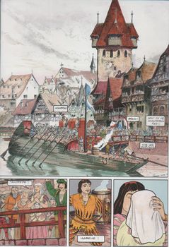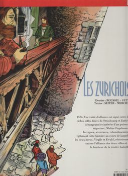 remarques: | titre complet: les Zurichois, la nef aventureuse édité par l'éditeur Nuée Bleue Strasbourg un bateau de Zurich apporta en 1576 à Strasbourg un chaudron de bouillie encore chaude, symbole de la rapidité d'intervention des cantons suisses de Berne, Bâle et Zurich, alliés à la ville libre de Strasbourg, l'exploit est raconté par Jean Fischart dans "das Glückhafft Schiff von Zürich" 1576, des magistrats suisses veulent prouver leur rapidité d'intervention, par la même occasion, le bateau apportera le jeune zurichois Tancrède qui doit épouser Isabelle, une jeune strasbourgeoise, mais tout cela n'arrange pas le tuteur d'Isabelle qui a dilapidé la fortune d'Isabelle qu'on lui avait confiée et qui doit être remise à Isabelle lors de son mariage, il décide alors de faire couler le bateau avant qu'il n'arrive à Strasbourg et ainsi faire périr l'équipage y compris le beau Tancrède pour que le mariage ne puisse avoir lieu, à cet effet, il loue les services d'une bande de brigands >> p. 6 un "Briefschreiber" (écrivain public de l'époque) >> p. 11 le concours de tir entre un arquebusier et un arbalètrier Isabelle découvre par hasard le complot, mais se fait surprendre, heureusement elle reçoit l'aide de deux jeunes strasbourgeois; ceux-ci avec une équipe de bateliers réduiront à néant l'embuscade dressé par les brigands >> p. 29 le château du Haut-Koenigsbourg, repaire des brigands >> p. 37 une petite mais efficace bombarde >> p. 45 l'arrivée à Strasbourg de la nef aventureuse (et une petite référence à Astérix avec Assurancetourix: non, tu ne chanteras pas) >> un petit récit sans grand intérêt mais basé sur un morceau véridique d'histoire suisse, texte et graphisme peu élaborés |