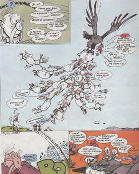 remarques: | F'Murr alias Richard Peyzaret, commence sa série du génie des alpages en 1974 dans Pilote tome 1 le génie des alpages histoire de moutons (bélier et brebis) sous forme de courts récits de deux pages avec comme personnages principaux: n.b. au premier plat: les fameuses parties de dames entre le chien et Atanase le berger - le vieux berger (Atanase) - le chien-berger - les moutons blancs dont Einstein, Rostand, Clopinette et autres - le mouton noir: Romuald le bélier - le lion-errant (aide-chien de berger) et son frère égyptien: Kattarsis le sphinx - Berthold, le chien Saint-Bernard = bête à manger du foin - l'ange-rapace >> p. 20/21 les sauts de mouton de Judicaëlle, Gargamelle, Armelle, Noëlle, Manivelle, Asphodèle, Radicelle, Caramelle, Poubelle, Urielle, Samaëlle, Anaelle, Amabielle, Mielle, Gabrielle, Sataelle, Rachielle, Séraphielle, Chédusitamielle, Goscinnaelle, Cestielle, Varicelle, Asasielle, Mazielle, Dardielle et autres Elles >> p. 30 Mac-Havenshnockbulltoch, la brebis de Shetland >> p. 47 la fondue sur l'alpage >> récits à humour philosophique (avec aussi des jeux de mots), le tout penché sur l'absurde et la réflexion surréaliste, un genre entièrement nouveau, un premier album qui sera surpassé par les prochains n.b. il y aura 14 albums de parus dans cette série, seuls les deux premiers sont collectionnés ici à titre d'exemplaire représentatif les autres albums: tome 3 - barre-toi de mon herbe 1977 tome 4 - un grand silence frisé 1978 tome 5 - les intondables 1980 tome 6 - Hi-Yo c'est l'écho 1981 tome 7 - tonnerre ... et mille sabots 1983 tome 8 - dans les nuages 1987 tome 9 - après nous ... le déluge? 1989 tome 10 - monter, descendre, ça glisse pareil 1992 tome 11 - sabotage et pâturage 1995 tome 12 - bouge tranquille! 1998 tome 13 - cheptel maudit 2004 tome 14 - courent dans la montagne 2007 |