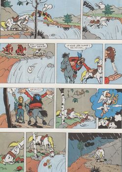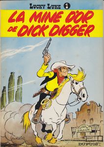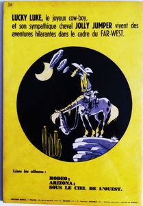 remarques: | le célèbre cowboy fait son apparition en 1946 dans le numéro 47 de Spirou et deviendra vite une extraordinaire parodie des thèmes westerniens, la série connaîtra son apogée avec la création des Dalton et des talentueux scénarios de Goscinny (à partir du no 9 puis du no 11), en 1968 la série passe dans Pilote et en 1974 Dargaud publie le Journal de Lucky Luke qui ne comportera que 12 numéros réédition 1969 dernier titre: tortillas pour les Dalton, 48 pages, deux épisodes: 1/ la mine d'or de Dick Digger (1947) Lucky Luke à la recherche des bandits Big Belly et Mestizo qui ont dévalisé le vieux prospecteur Dick Digger de son or >> p. 14 la pub pour le whisky (a bottle a day, keeps the doctor away) >> p. 17/18 pseudo-mort de Lucky Luke et tentative de suicide de Jolly Jumper >> p. 23 le guet-apens de Lucky Luke (la souricière) 2/ Silverbrook Lucky Luke est le sosie du fameux bandit Mad Jim qui dans sa cellule a été condamné à mort, 2 autres bandits ont l'idée de capturer Lucky Luke et de le mettre à la place de Mad Jim, évasion de Lucky Luke qui recherche les bandits, rencontre avec les indiens et finalement le shérif fait identifier le vrai Lucky Luke par son cheval >> p. 34 la pendaison (ressemble un peu à celle de Tintin en Amérique) >> c'est un premier bon album, ce n'est pas encore l'apothéose, mais les scénarios sont déjà bien charpentés et le graphisme s'améliorera lentement, Jolly Jumper est déjà là ainsi que les croque-morts et si Lucky Luke ne tire pas encore aussi vite que son ombre, il tire déjà très vite en annexe: premier plat et quatrième plat de l'édition originale avec un extrait de l'album, n.b. les 3 premiers albums brochés etoriginaux de Lucky Luke sont côtés à Euros 1000.- Information Lucky Luke est une série de bande dessinée belge de western humoristique créée par le dessinateur belge Morris dans l'Almanach 1947, un hors-série du journal Spirou publié en 1946, Morris est aidé, à partir de la neuvième histoire, par plusieurs scénaristes dont le plus fameux est René Goscinny, depuis la mort de Morris en 2001, le dessin est assuré par Achdé la série met en scène Lucky Luke, cow-boy solitaire au Far West, connu pour être l'homme qui tire plus vite que son ombre, accompagné par son cheval Jolly Jumper et ensuite par le chien Rantanplan, lors de ses aventures, il doit rétablir la justice dans le Far West en pourchassant des bandits dont les plus connus sont les frères Dalton, la série est truffée d'éléments humoristiques qui parodient les œuvres de western la série compte, en 2024 plus de 80 albums parus dont le dernier "un cow-boy sous pression" par le duo dessinateur Achdé et scénariste Jul tout d'abord aux éditions Dupuis, puis Dargaud et enfin Lucky Comics, chaque histoire a aussi été pré-publiée dans un journal: entre 1946 et 1967 dans Spirou, entre 1967 et 1973 dans le journal Pilote, entre 1974 et 1975 dans le journal Lucky Luke, de 1975 à 1976 dans l'édition française du journal Tintin, puis la série change de support entre les histoires avec Spirou et Pif Gadget, mais aussi dans des magazines comme Paris Match ou VSD il s'agit d'une des bandes dessinées les plus connues et les plus vendues en Europe, traduite dans de nombreuses langues, la série a aussi été adaptée sur de nombreux supports, en longs-métrages d'animation et séries animées pour la télévision, en films, jeux vidéo, jouets et jeux de société, le terme Lucky Luke est depuis devenu dans les sociétés française et belge synonyme de rapidité Morris, considérant que Dupuis fait du mauvais travail pour la diffusion sur le marché français, préfère alors se tourner vers Dargaud, un éditeur français, à la fin des années 1960, Lucky Luke abandonne les pages du journal Spirou et les éditions Dupuis pour celles de Pilote et les éditions Dargaud, avec ce changement d'éditeur, la popularité et les ventes d'album de Lucky Luke vont croître considérablement, la série Lucky Luke fait sa dernière apparition dans le journal Spirou du no 1537 au no 1556 avec l'histoire le Pied-Tendre, contrairement à la rumeur, Morris n'a quitté Dupuis ni à la demande de René Goscinny qui souhaite réunir ses séries dans Pilote, ni parce que Dupuis aurait refusé d'imprimer Lucky Luke sur des albums cartonnés la première histoire publiée dans Pilote est Dalton City dans le no 441 du journal et dans la foulée sort la diligence, le premier album cartonné aux éditions Dargaud, c'est à cette occasion que René Goscinny invente la formule devenue notoire: l'homme qui tire plus vite que son ombre, qu'il place en en-tête des albums, le passage de la série de Spirou à Pilote permet à René Goscinny d'aborder des sujets plus modernes et d'introduire des histoires d'amour (Dalton City), la victimisation des Amérindiens lors de la conquête de l'Ouest (Canyon Apache), l'ambiguïté des héros de l'Ouest qui ne sont motivés que par l'appât du gain (chasseur de primes) ou encore la psychanalyse (la guérison des Dalton) la présence régulière de Lucky Luke dans le journal Pilote ne durera que cinq ans, constatant que le journal a changé de visage et de public, Goscinny et Morris estiment que la série n'y a plus sa place, Lucky Luke fait donc sa dernière apparition en 1973 dans le no 736 de Pilote avec la fin de l'histoire l'héritage de Rantanplan, dès lors, la série devient errante, elle est présente parfois dans des journaux de BD comme Tintin, Spirou où elle fait son retour et parfois dans Pif Gadget, mais aussi dans des journaux généralistes comme le Nouvel Observateur et Paris Match, entre-temps est créé le journal Lucky Luke sur une idée des éditions Dargaud qui pensaient que la série avait l'envergure pour être la vedette d'un périodique, le journal, lancé en 1974 alors que les journaux de bande dessinée entrent dans une période de crise, ne paraît que l'espace d'une année avec