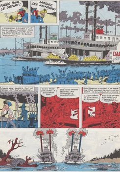 remarques: | 46 pages la ville cosmopolite de New Orleans où se développe une rivalité entre le capitaine Barrows de la "Daisy Belle" et du capitaine Lowriver de "l'Asbestos Plower", ceux-ci décident d'un pari sur une course New Orleans à Minneapolis pour régler leur différend le trajet: New Orleans - Bâton Rouge - Vicksburg - Memphis - Cairo - St-Louis - Dubuque - Minneapolis >> p. 6 le pari mais le cours du fleuve Mississipi est très capricieux, parfois à sec, parfois inondé et Lucky Luke qui a pris le parti de la Daisy Belle aura fort à faire pour déjouer les attentats de Cards Devon joueur professionnel, de Têtenfer le lutteur et de Pistol Pete le gunman finalement le capitaine Lowriver perdra son pari, sa chaudière explosant durant le dernier tronçon >> p. 22 la "Daisy Belle" dans toute sa splendeur >> p. 34 les bateaux à snags (qui repêchent les troncs d'arbres qui dérivent) >> p. 37 l'exercice de tir de Pistol Pete >> un très bon épisode de Lucky Luke, surtout pour le graphisme, un des meilleurs albums de la série Dupuis, tiré d'ailleurs d'une histoire véridique |
