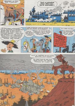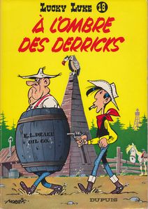 remarques: | 46 pages l'histoire du pétrole et du colonel Drake, premier prospecteur en 1857 de pétrole à Titusville (Pennsylvania) la ruée vers le pétrole, Lucky Luke est chargé de maintenir l'ordre à Titusville, le problème des barils pour le transport du pétrole >> p. 12 l'origine du mot derrick = potence n.b. le derrick serait une tour soutenant le dispositif de forage d'un puits de pétrole, le nom de cette tour viendrait de Thomas Derrick, célèbre bourreau de Tyburn, principal lieu des exécutions capitales des criminels anglais, le mot anglais a d'abord signifié "potence, gibet" et au XIXe siècle, tour de forage des puits de pétrole Lucky Luke aura beaucoup affaire avec Barry Blunt, le desperado du pétrole, ex-avocat et ex-homme de loi qui donnera du fil à retordre à Lucky Luke, mais Barry Blunt sera battu avec ses propres armes >> un album tout à fait raisonnable axé sur le pétrole et ses nuisances, mais qui apportera la richesse à l'est des Etats-Unis, bon scénario et surtout un graphisme de grande qualité, mais pas de poor lonesome cowboy dans la dernière vignette, et à nous le Texas à la place |