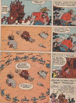 remarques: | 46 pages, édition originale BE, mais couverture 1er plat un peu froissée (album côté Euros 60.- au BDM pour une qualité BE) Lucky Luke est chargé de conduire Billy the Kid de sa prison (il est condamné à 1247 années de travaux forcés) à Bronco Pueblo pour y être jugé d'un autre crime et cette fois pas d'évasion des Dalton, mais Billy the Kid espère bien pouvoir s'évader malgré l'escorte de Lucky Luke durant le voyage après bien des péripéties dont le duel final entre Lucky Luke et Billy the Kid, le procès se finit par une amende de 5.- dollars infligé à Billy the Kid pour mauvais stationnement de son cheval à Bronco Pueblo >> p. 33 les bandits attaquent la diligence et les indiens attaquent les bandits qui attaquent la diligence >> p. 37 la soif insatiable de Billy the Kid après le repas mexicain (enchiladas, tortillas, tacos, tamales et la sauce tabasco) >> un récit assez banal, mais qui a sa portion de charme et toujours un bon graphisme |