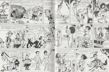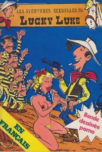 remarques: | album broché petit format en noir&blanc de 64 pages sans date mais parution probable vers 1980 divers épisodes porno sur fond de récits parus avec Lucky Luke et sa grosse bite dont rencontre avec Calamity Jane, l'épreuve sexuelle chez les apaches, rencontre avec Billy the Kid, le cirque du sexe, le convoi des vierges, la princesse Fedora, rencontre avec Jessie James, soeur de Jesse James, les adorateurs solaires, Lucky Luke chez les putains, à l'hôpital donnant des cours de sexologie, contre la bande de Satan et rencontre avec la femme extra-terrestre >> des aventures non seulement porno, mais aussi très très mal dessinées avec un texte à l'accent belge qui est également très mauvais, la nouvelle chanson de Lucky Luke: I'm a poor lonesome cowboy and I'm fucking far away from home un album de collection mais dénué de tout intérêt |
