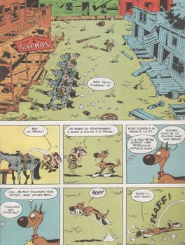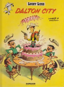 remarques: | 46 pages, dernier titre Ma Dalton (l'ordre des titres n'est pas respecté) la ville desperado de Fenton Town dirigée par le truand Dean Fenton installé au "Queen-of-hearts" saloon, Lucky Luke (dont la ville d'origine est Nothing Gulch au Texas) est chargé de rétablir l'ordre et l'autorité dans cette ville de débauchés >> p. 9 un Lucky Luke assez féroce avec un Joe Dalton encore plus féroce Joe Dalton est libéré par erreur et après avoir fait aussi sortir ses frères de prison, accompagné également de Rantanplan, Joe reprend pour son compte Fenton Town et fonde Dalton City >> p. 21 la charmante cité de Fenton Town Lucky Luke arrive à Dalton City et est fait prisonnier par les Dalton qui veulent faire revivre Dalton City >> p. 29 l'arrivée de la troupe de Lulu Carabine avec ses girls Belle, Sugar, Linda, Perle et leur pianiste Wallace pour détourner l'attention des Dalton, Lucky Luke fait croire au mariage de Lulu Carabine avec Joe Dalton, s'en suit un désordre total à Dalton city et finalement les Dalton retourneront au pénitencier accompagnés de la bande de desperados invités pour la noce >> p. 39 la colère de l'indien Truite Sauvage à la roulette du casino de Dalton City >> un album un peu banal, mais d'un certain intérêt avec la troupe des Lullu Belle girls et également un très bon graphisme et coloriage en dernière page: une planche de Morris sur les Dalton |