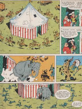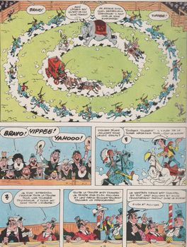 remarques: | 46 pages, dernier titre: Ma Dalton (l'ordre des titres n'est pas respecté) rencontre inopinée dans la prairie de Lucky Luke avec Andy, l'éléphant dressé du western circus dirigé par Erasmus Mulligan (les peaux-rouges le décrivent comme un animal avec une grande queue devant et une petite queue derrière) >> p. 5 présentation du western circus dont Nelson, le vieux lion borgne qui aime le potage aux légumes arrivée du western circus au rodeo Zilch de Fort Coyotte où D.D. alias dent de diamant alias Corduroy Zilch fait la loi, le western circus engage Lucky Luke comme artiste >> p. 8 l'attaque du western circus par les indiens de Boeuf Boiteux >> p. 19 Jolly Jumper qui démontre ses talents de dompteur en sifflant Lucky Luke pour le faire venir pour se débarrasser des gens du cirque, D.D. fait appel à Rattlesnake Joe, le tueur à gages qui après coup doit laisser tomber l'affaire, ses nerfs l'ayant lâché >> p. 21 petite démonstration du tir de Rattlesnake Joe >> p. 32 le numéro de cirque de Jolly Jumper et >> p. 36 le numéro de cirque de Lucky Luke >> p. 36 nouvelle attaque des indiens avec de nouvelles peintures de guerre >> p. 38 pour une fois, la cavalerie US arrive en retard >> p. 40 réapparition des Lulu Belle girls le rodeo de Fort Coyotte combiné avec une représentation bénévole du western circus pour améliorer l'ordinaire des repas dans la prison de Fort Coyotte >> p. 41 D.D. appelé M'sieur Dédé par Jules Framboise, un imprésario français en visite dans l'Ouest >> p. 43 c'est extraordinaire pour un homme qui fume tellement (dixit Jules Framboise en parlant des prouesses de Lucky Luke) >> p. 46 le western show du cirque Zilch+Mulligan qui tous deux ont fini par s'entendre >> un des meilleurs albums de la série, scénario et graphisme exceptionnels avec un splendide coloriage |