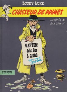 remarques: | 46 pages, dernier titre: chasseur de primes (l'ordre des titres n'est pas respecté) description du méprisable métier de chasseur de primes en général et du chasseur de primes Elliot Belt et son cheval Wanted en particulier (ressemblance avec Lee Van Cleef) enlèvement de l'étalon Lord Washmouth III appartenant à Bronco Fortworth, éleveur de chevaux à Cheyenne Pass, le cheyenne Teaspoon est soupconné d'être le voleur de chevaux >> p. 9 le salon chevalin de Bronco Fortworth une récompense de 100'000 dollars est mise par Fortworth pour retrouver Teaspoon qui est immédiatement pris en chasse par Elliot Belt, démêlés avec les cheyennes de Little Fish Knife, Elliot Belt fait alors appel à tous les chasseurs de primes de la région pour retrouver Teaspoon >> p. 18 l'attelage du buggy de Fortworth >> p. 35 Jolly Jumper se fâche avec Lucky Luke qui en a marre des chevaux finalement Washmouth III sera retrouvé dans un troupeau de juments sauvages et Thelma Fortworth, la femme et petite jument de Bronco Fortworth, reconnait avoir laissé échapper Washmouth, car elle se sentait délaissée par Bronco réconciliation générale et la réserve cheyenne devient le parc de loisirs Cheyenneland grâce aux 100'000 dollars accordés par Fortworth aux cheyennes, toutefois Elliot Belt, le chasseur de primes méprisé, deviendra lui-même gibier pour chasseurs de primes >> bon album, bon graphisme, scénario original, récit quelque peu dédié aux chevaux et à Jolly Jumper |