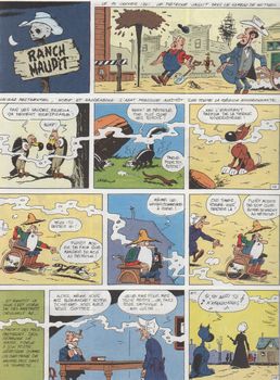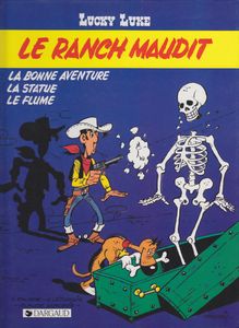 remarques: | 46 pages, titre complet: le ranch maudit et autres histoires, dernier titre: le ranch maudit (titre inversé au 4ème plat) album en 4 épisodes: 1/ le ranch maudit une histoire de maison hantée avec miss Bluemarket et ses trois bisons qui louchent ainsi que l'apparition d'un prince des ténèbres et >> p. 6 réapparition de Alfred Hitchcock en serveur de saloon 2/ la bonne aventure madame Irma, la fausse voyante qui prévoit des hold-ups fabriqués maison 3/ la statue histoire des sculpteurs du mont Rushmore avec le sculpteur Michelangelo junior qui executera les statues de Lucky Luke et surtout de Jolly Jumper 4/ le flume (= courant d'eau, canal servant de glissoire pour le transport des troncs d'arbres vers une scierie) commerce de bois, lutte contre le monopole de Butterfield >> les récits sont racontés sans grand intérêt de par le scénario et le texte, mais basés sur des faits plus ou moins authentiques, le graphisme reste convenable avec toujours une qualité d'impression moins bonne en dernière page: l'utilisation d'un flume (24 km en 11 minutes = 130 km/h) |