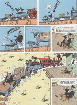 remarques: | 46 pages, dernier titre: nitroglycérine dernier album aux éditions Dargaud à noter: - sur la couverture d'album, réapparition du portrait de Lucky Luke avec la brindille d'herbe qui remplace le mégot de cigarette qui n'est toutefois pas oublié sur le quatrième plat - Dargaud devient Dargaud (Suisse) S.A. mais l'album reste imprimé en France conflit entre la Central Pacific et l'Union Pacific, les explosifs de la Central Pacific ayant été explosés par son concurrent, on se résout à employer de la nitroglycérine qui est très dangereuse au transport Lucky Luke est chargé de défendre les intérêts de la Central Pacific contre les saboteurs de l'Union Pacific et contre les Dalton qui croient que la caisse de la nitroglycérine contient de l'or >> p. 8 l'emballage de la nitroglycérine >> p 23 la locomotive, conduite par un capitaine de vaisseau, qui vole en franchissant un pont détruit >> un album sans grande saveur, on tourne beaucoup en rond avec un train nitro fou et en dernière page: la construction du chemin de fer de l'Union Pacific (gravure d'époque) |