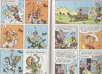 remarques: | album no 31, 72 pages, format 16x22 cm, contenant 6 épisodes 1/ défi à Lucky Luke Omer Marshmellow, le desperado pied-tendre, car la célébrité est la qualité principale du métier de desperado, les Dalton et Billy the Kid ayant la meilleure célébrité Omar Marshmellow osera défier Lucky Luke à Nothing Gulch 2/ arpèges dans la vallée le transport du piano mécanique Stringmann de Chicago appartenant à Sean O'Flanagan et tout ce bon transport pour des flûtes! >> p. 25 O'Flanagan l'irlandais têtu qui veut franchir un précipice avec son piano 3/ promenade dans la ville description d'une cité dans l'Ouest comportant le saloon, la prison, le magasin général, l'école, les pompes funèbres, l'imprimerie, la blanchisserie, la banque, l'armurerie, le temple, le barbier et la société des vieilles dames 4/ la bonne parole du missionnaire Asbestos Misbeliever 5/ le desperado à la dent de lait visite chez le dentiste pour le petit Johnny 6/ la bataille du riz (première version) épisode chinois, concurrence entre restaurants chinois et japonais >> épisodes tirés du Journal de Lucky Luke, pas toujours très convaincants, mais quand même assez intéressants Information en musique, un arpège est une série de notes émises successivement et qui, considérées ensemble, forment un accord |