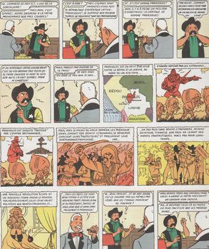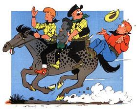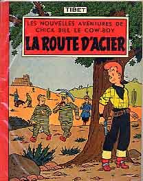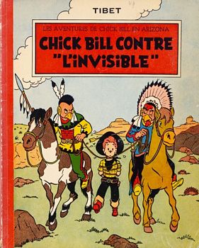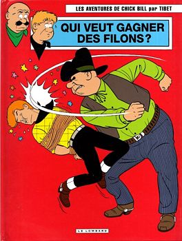 remarques: | les aventures de Chick Bill, toilé, 62 pages collection Lombard Bédingue édition original Lombard = 1956 à Wood City, Kid Ordinn est confondu par deux espions pour le président Viva Patata du Parasolos et pris en otage par de mystérieux partisans, bien sûr la bande des quatre (maintenant trois) partent de suite à la recherche de Kid Ordinn arrivés au Parasolos, les 3 rencontrent Cab Stokos, le concurrent de Viva Patata, qui veut être élu président du Parasolos lors des prochaines élections et qui détient prisonnier le vrai Viva Patata, alors que des ministres peu scrupuleux utilisent Kid Ordinn comme sosie de Viva Patata, Kid Ordinn étant sous leur contrôle >> p. 6 le drapeau de Parasolos et ses citoyens les parasolossiens >> p. 15 Confetti, le cheval de Chick Bill Chick Bill réussit à convaincre Cab Stokos de libérer le vrai Viva Patata et de gouverner avec lui, Viva Patata restant sous le contrôle de Cab Stokos et Viva Patata accepte aussi cette combination Kid Ordinn est donc échangé à la place de Viva Patata, les ministres peu scrupuleux sont écartés, mais Kid Ordinn aurait bien voulu rester président du Parasolos >> p. 20 le drapeau des du Parasolos et celui >> p. 51 des révolutionnaires du Parasolos >> aventures sud-américaines révolutionnaires pour la bande des quatre (Chick Bill, Petit Caniche, Dog Bull et Kid Ordinn) avec des dictateurs à gogo qui se ressemblent mais ne s'assemblent pas, le scénario est un peu compliqué, le texte pas terrible, le graphisme reste encore faible et le manque de décors est manifeste (Tibet admirant le style Hergé, la ligne claire), mais c'est le premier album où l'humanisation des personnages est complétée (les trois albums précédents comportaient encore des personnages à tête d'animal) annexes - couverture de l'album - extrait de page - la bande des quatre - portrait de Kid Ordinn - couverture des trois premiers albums - couverture du dernier album (2010) les trois premiers albums ne sont pas collectionnés ici, ce sont: - 1954 tome 1 Chick Bill contre l'invisible - 1954 tome 2 les carottes sont cuites - 1955 tome 3 la route d'acier n.b. la série comprend une centaine d'albums, seuls quelques albums sont collectionnés ici à titre d'exemplaire représentatif le héros Chick Bill fut créé en 1953 dans le cadre d'un western animalier, paru tout d'abord dans le journal belge Chez-Nous-Junior, les personnages passent à Tintin en 1956 dès la route d'acier, Chick Bill devient un jeune cowboy dynamique flanqué d'un trio d'inséparables compères (le jeune indien Petit Caniche, le shérif Dog Bull et son adjoint Kid Ordinn, Tibet aura été dessinateur et scénariste pour la plupart des albums avec en grande partie Greg comme scénariste, Duchâteau participera souvent comme scénariste et enfin Goscinny écrira le scénario de la bonne mine de Dog Bull (1959) ces albums de Chick Bill sont aussi édités dans plusieurs collections: - collection Lombard, 11 albums 1954-1962 - Jeune Europe, 8 albums brochés 1963-1967 - collection Chick Bill, 10 albums brochés 1968-1972 - collection Lombard-Dargaud, 60 albums cartonnés, 1973-2010 dernier titre: qui veut gagner des filons? scénario et dessin par tibet - collection BéDingue 1983-1986 = réédition des 5 premiers albums - collection Dog Bull et Kid Ordinn 4 albums brochés, 1959 - collection Rijperman tirage de luxe 1983 6 albums = réédition des albums 5 à 10 + les intégrales, 20 albums (1999-2013) Information - les aventures de Chick Bill est une série de bande dessinée créée par Tibet, reprenant les codes et l'univers du western, elle raconte les aventures humoristiques d'un jeune cow-boy, Chick Bill et ses compagnons - Tibet est l'auteur à part entière d'une grande partie des épisodes, mais la série a également été scénarisée par André-Paul Duchâteau et Greg ainsi que le temps d'un épisode, par René Goscinny, - les dessins des deux derniers albums sont co-signés par Tibet et Frank Brichau - le jeune cow-boy Chick Bill vit des aventures trépidantes, toujours accompagné de ses amis, le jeune Indien Petit Caniche, le shérif Dog Bull et le shérif adjoint Kid Ordinn, l'action se passe pour l'essentiel en Arizona où se trouve la ville imaginaire de Wood City dont Dog Bull est le shérif, mais les protagonistes peuvent être amenés à se déplacer dans d'autres régions des États-Unis, voire dans d'autres pays, - les péripéties vécues par les héros sont souvent sérieuses, mais les histoires gardent toujours un ton léger, voire loufoque, avec Dog Bull et surtout Kid Ordinn dans les rôles des personnages comiques les personnages: - Chick Bill: jeune cow-boy courageux et altruiste, excellent tireur, il aurait pris des cours auprès de Lucky Luke - Petit Caniche: enfant indien blackfoot, ami de Chick Bill, qu'il accompagne constamment, intrépide et forte tête, il fait preuve à l'occasion d'une force physique surprenante - Dog Bull: shérif de Wood City, ami de Chick Bill, honnête, mais bourru et quelque peu borné, il est régulièrement enragé par les maladresses de son adjoint Kid Ordinn, qu'il a tendance à tyranniser - Kid Ordinn: adjoint de Dog Bull, ami de Chick Bill, benêt, goinfre, maladroit et immature, il fait figure à Wood City moins de policier que d'idiot du village, toutefois ses gaffes et ses mésaventures fournissent souvent le moteur de l'action, au point qu'il devient l'antihéros de la série dont il prend progressivement la vedette aux dépens de Chick Bill lui-même, outre les histoires longues, il est également le protagoniste à part entière d'histoires comiques courtes, appelées les kidordinneries - Black Skelett: méchant dans plusieurs épisodes; hors-la-loi cruel et vindicatif, particulièrement haineux à l'égard de Kid Ordinn - Panthario: hors-la-loi mexicain au visage de félin, méchant récurrent des trois premiers albums, il disparaît au moment où Tibet abandonne le style an