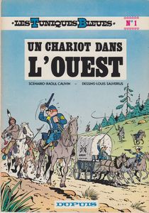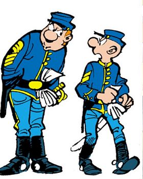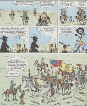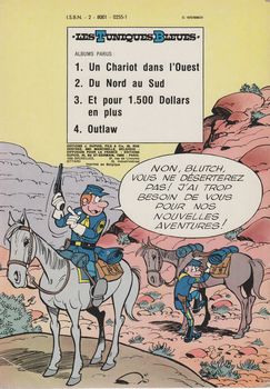 remarques: | album broché généralement de 46 pages, format 29 x 20 cm, western comique avec les aventures du sergent Cornelius Chesterfield, bête, mais fidèle et admirateur de l'armée ainsi que du caporal Blutch, lucide et résigné qui veut absolument quitter l'armée, aventures parues dans Spirou dès 1968 et comportant de nombreux épisodes sur la guerre de Sécession scénario: Cauvin, graphisme: Salverius pour 6 albums, la suite étant reprise par Lambil n.b. il y aura jusqu'en 2025 69 albums de parus le no 64 "où est passé Arabesque" étant le dernier album scénarisé par Cauvin, décédé en 2021, toutefois il y a interversion le no 64 par Cauvin est daté de 2021 alors que le no 65 est daté de 2020 n.b. seuls les 37 premiers albums sont collectionnés ici les héros du 22ème régiment de cavalerie: sergent Chesterfield et caporal Blutch actuellement à Fort Bow sous le commandement du colonel Appletown et de sa fille Amélie Appletown, les camarades de Blutch et Chesterfield: les soldats Tripps et Bryan et l'éclaireur indien Plume d'Argent 1ère mission pour Chesterfield: convoyer un convoi de munition vers fort Defiance à travers les lignes des Comanches >> p. 14 raté d'un quart de poil de mollet de fourmi >> p. 17 l'inscription US go home sur la palissade de fort Defiance >> p. 31 le guerrier apache petit-nuage-d'avril le chariot sera volé par un trappeur qui le vendra aux Comanches qui sera volé à son tour par les Apaches, ce sera l'histoire du chariot de munition et de la décoration manquée de Chesterfield: s'il existait des médailles accordées aux imbéciles, il n'y en aurait jamais assez pour en recouvrir votre poitrine dixit le commandant Appletown >> un premier album déjà bien élaboré avec un bon graphisme de Salverius, quelque ressemblance avec Lucky Luke, mais le héros cette fois n'est pas solitaire et le récit se développe surtout autour des disputes entre Chesterfield et Blutch avec une nette critique anti-militariste annexes - couvertures Ier et 4ème plat - extrait de page - portraits de Blutch et Chesterfield Information dans les aventures des Tuniques Bleues, Appletown s'écrit souvent aussi Appeltown |