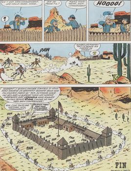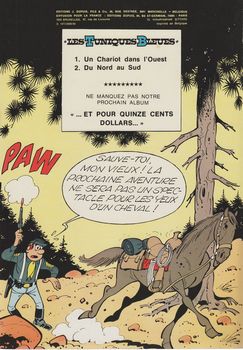 remarques: | début des épisodes avec la guerre de Sécession Blutch et Chesterfield font partie de l'armée de Grant qui combat celle de Lee et les deux compères passent sous les ordre du colonel Stark qui commande une brigade de cavalerie sous le sobriquet "chargez" et qui deviendra le célèbre 22ème régiment de cavalerie attaque du pont, prisonniers des Johnny Rebs, évasion, bataille pour les canons, reprise du pont et retour à Fort Bow en permission en emmenant le capitaine Stark blessé, mais avec les indiens Cherokee à leur poursuite en prime >> p. 13/14 les vagues successives des fantassins à l'assaut du pont >> p. 28 Chesterfield surnommé Billy Yank par les sudistes >> p. 48 l'attaque de Fort Bow par les Cherokee >> premier album sur la guerre de Sécession, toujours de bonne fracture et avec une jolie couverture d'album (mais pas en faveur de la guerre) n.b. dans les premiers albums, le 4ème plat fait office d'annoncement pour les prochaines aventures de Blutch et Chesterfield |
