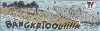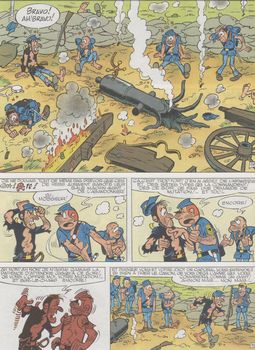 remarques: | toujours en pleine guerre de Sécession le duo Blutch/Chesterfield sous les ordres de Monsieur "chargeeez" = le capitaine Stark, Blutch fait le mort lors de la charge et Chesterfield qui veut s'occuper de lui et qui pour cela désobéit au capitaine Stark est dégradé de la cavalerie et relégué à l'infanterie >> p. 6 la ruse de Blutch pour éviter la charge de cavalerie et où l'amour entre Blutch et Chesterfield est au moins égal à leur animosité peu après, Blutch est aussi muté dans l'infanterie, on les envoie alors en mission derrière les lignes ennemies, mais sans grand succès, ils sont mutés tout à tour dans l'artillerie, comme infirmier et enfin dans la marine duel entre les cuirassés "Merrimac" (sudiste) et "Monitor" (nordiste) ainsi qu'entre un sous-marin contre le navire Davidley (nordiste) >> p. 16 le piège sudiste >> p. 24 l'attaque du voilier nordiste par le sous-marin >> p. 35 le gros dos gras et musclé du sergent Chesterfield >> p. 38 Merrimac contre Monitor = match nul heureusement tout s'arrangera, Blutch sera même décoré et tous les deux retourneront à la cavalerie >> un récit bien élaboré, un épisode maritime bien conçu |