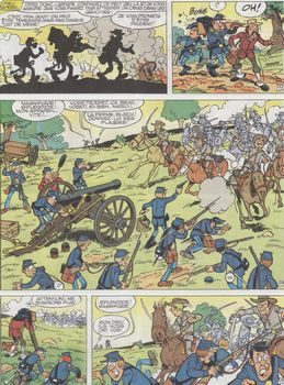 remarques: | retour au dessinateur Lambil le photographe de guerre, M. Brady et où la photo commence à diffuser les images de la guerre, Blutch et Chesterfield sont nommés gardiens-protecteurs du photographe, mais après un certain temps avec le photographe, Blutch préfère encore la compagnie du capitaine Stark, toutefois Blutch est promu photographe officiel en remplacement de Brady, blessé au combat et pour la première fois, Chesterfield se rebelle contre l'armée (à cause d'une injustice) alors que Blutch répare cette injustice en convoquant la presse >> p. 30 c'est pas juste pour Chesterfield >> p. 34 visite du président Lincoln qui décore Chesterfield des palmes du mérite pour avoir mené la charge de cavalerie sans Stark, une tribune sera bâtie pour le président afin que celui-ci puisse observer les combats! >> p. 37 le défilé militaire pour le président l'armée sudiste reprend l'avantage et le président doit faire retraite précipitamment sous la protection de Blutch et Chesterfield qui eux seront faits prisonniers et qui seront décorés à nouveau, mais cette fois à titre posthume par le président Lincoln >> p. 43 mais lors de sa retraite, la vie du président ne tient plus qu'à un fil >> un bon album avec à nouveau une critique acerbe et très ironique sur l'armée et la guerre |
