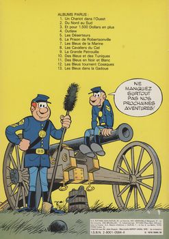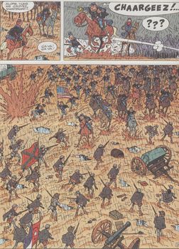 remarques: | l'absence de femmes (à part Amélie Appeltown) se faisant lentement sentir, cet album comble ce vide (en l'occurence avec Johan de Bellevue) Blutch et Chestefield en patrouille découvrent un soldat féminin nordiste prenant son bain, engagée dans l'armée pour l'honneur de la famille >> p. 5 pour une fois Appletown écrit correctement au lieu de Appeltown >> p. 6 pour l'honneur de la famille >> p. 10/11 on fait maintenant le mort en duo (Blutch et la femme-soldat) >> p. 15 le sommeil de Stark sur son cheval la guerre se déroule maintenant dans la boue (= la gadoue), mais sans l'aide de l'armée du salut >> p. 16 la pluie est néfaste pour l es charges de cavalerie >> p. 19 la charge dans la boue avec pélerine assortie >> p. 20 c'est de nouveau miss Appeltown >> p. 22 le capitaine Stark a une extinction de voix, ce qui empêche toute nouvelle charge >> p. 28/29 des planches bd pleines de boue où les combats se poursuivent à main nue et les combats dans la boue ne distinguent plus ni ami ni ennemi et Johan, la femme-soldat, se révèle être une espionne sudiste >> p. 25 Chesterfield qui est mené par le bout du nez >> p. 39 et Cauvin n'est pas tendre avec les femmes à la recherche de l'espionne, nos deux amis sont faits prisonniers par les sudistes qui veulent les fusiller, mais ils seront délivrés par l'espionne repentie, puis à nouveau prisonniers des nordistes comme déserteurs et ce sera finalement Blutch qui sauvera la vie de Chesterfield quant à Johan de Bellevue, on n'en parlera plus >> un album boueux, mais assez intéressant, première apparition féminine à côté d'Amélie Appeltown et où Blutch se montre une vraie mère-poule pour son sergent n.b. le 4ème plat de l'album ne connaîtra plus aucun changement dans la suite de la série |