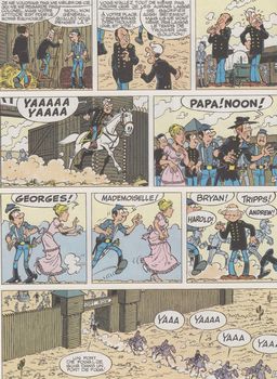 remarques: | retour à Fort Bow pour Blutch et Chesterfield en permission, mais lors du bal des gradés célébré en l'honneur des 20 ans d'Amélie Appeltown, Chesterfield devient jaloux de Georges, un concurrent, qui semble très proche d'Amélie >> p. 10 le Charlie's saloon au Charlie's saloon, Chesterfield devient intelligent en buvant >> p. 13 le coup de maître de Blutch (en mentionnant Amélie) bagarre au saloon, Georges, le soi-disant prétendant d'Amélie, un blanc-bec, est chargé de rétablir l'ordre, le fils du chef indien Loup gris est blessé par un coup de feu tiré par Georges révélation après la bagarre, Georges est le frère d'Amélie et non son amoureux, démêlés avec les comanches de Loup Gris, pour avoir blessé son fils, comme punition, Georges est affecté par son père au 22ème de cavalerie puis rejoint par Blutch et Chesterfield >> p. 27 une communication difficile à transmettre >> p. 34 le capitaine Stark au point de départ durant les charges, Blutch essaie de convertir Georges à ses méthodes, mais Georges n'en veut pas, tout reviendra en ordre mais les Comanches sont à nouveau en révolte à cause de Chesterfield >> un bon album dans la lignée des Tuniques Bleues avec un texte amusant et un graphisme bien élaboré |