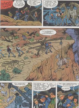 remarques: | station ferroviaire de Hickory Wood sous la pluie, Blutch et Chesterfield sont en mission pour réceptionner les nouveaux chevaux destinés au 22ème de cavalerie, mais en fait de chevaux, ce sont trois mules, un âne et un chameau qui sont réceptionnés >> p. 11 l'espion sudiste dans son coin Blutch et Chesterfield sont alors chargés de trouver des mustangs avec Ben Willcox, dit Bronco Benny, un grand dresseur de chevaux sauvages >> p. 12 apparition du général sudiste Lee achat de mustangs avec leur leader Traveller, le chef de troupeau, qui seront domptés par Bronco Benny et payés par Chesterfield, mais l'affaire tourne à l'avantage des vendeurs qui se révèlent être des sudistes déguisés en cowboys et qui capturent à leur tour le trio >> p. 35 une bonne idée de Chesterfield qui arrive toutefois trop tard, >> p. 41 tel est pris qui croyait prendre, mais l'arrivée du général Lee avec sa troupe changera la donne, Lee gardera les mustangs pour la cavalerie sudiste, mais bon joueur remboursera et laissera partir Blutch et Chesterfield (un penchant de Cauvin pour la cause confédérée) >> un album quelque peu hippique et philosophique avec une certaine sympathie pour les sudistes représentés par le général Lee, un brave et loyal adversaire, alors que les nordistes sont plutôt cyniques et matérialistes |
