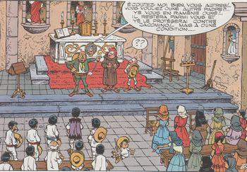 remarques: | aventures mexicaines pour Blutch et Chesterfield pourchassés par les Rebs à la frontière mexicaine, démêlés aussi avec les Apaches de Jacomino et les desperados de Diaz >> p. 11 la tonsure du padre Chesterfield pour échapper aux Apaches >> p. 13 Jacomino l'Apache déguisés en padre et en peone sur le chemin du retour, le duo sera sauvé in extremis des Apaches par les desperados mexicains qui veulent utiliser un "padre" pour se concilier la population d'un village, le duo devra même célébrer une messe dans l'église du village >> p. 18 dire la messe à la façon Blutch finalement, Blutch et Chesterfield réussiront à délivrer une mystérieuse prisonnière qui n'est autre que Amélie Appeltown, retenue comme otage contre des armes et munitions qui devront être délivrés aux outlaws et cette affaire réglée, tous se retrouveront sains et saufs à Fort Bow, mais la tonsure de Chesterfield déclanchera un rire général parmi la garnison >> p. 37/39 le rire hilarique d'Amélie >> p. 46 ite missa est >> un album humoristique pas très classé, mais respectable, c'est un peu la reprise du film les sept mercenaires |