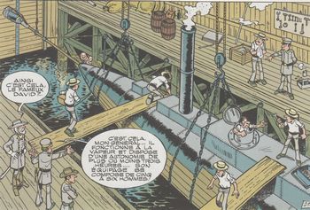 remarques: | lors de combats navals, un mystérieux engin sudiste coule de nombreux navires nordistes, alors que Blutch refuse catégoriquement de charger encore avec le capitaine Stark le peloton d'exécution attend Blutch, mais l'ordre sera annulé, si Blutch et Chesterfield acceptent de partir en mission secrète à Charleston, port sudiste, pour enquêter sur l'engin diabolique >> p. 11 critique à l'état-major nordiste, surtout au capitaine Stilman qui donne des idées, mais qui ne veut pas les exécuter lui-même >> p. 12 une belle vue de Charleston >> p. 15 les allemands ravitaillant les Confédérés avec Dreimalvieristzwölf, capitaine de la marine marchande allemande >> p. 18+23 le sous-marin sudiste "le David" leur mission accomplie, ce sera la course-poursuite de Blutch et Chesterfield pour regagner les lignes nordistes >> p. 30 la fuite de Chesterfield et Blutch déguisés en pasteur et sa fille (de travestissement en travestissement) >> p. 37 rencontre malheureuse avec une ancienne connaissance: "le cancrélat" et avec un troupeau de cochons et grâce aux informations de Blutch et Chesterfield, les nordistes renforçent la coque de leurs navires avec des plaques d'acier, ce qui leur donnera la suprématie sur la flotte confédérée >> p. 44 le mystérieux message nos deux héros seront récompensés, Chesterfield deviendra lieutenant et Blutch sera autorisé à retourner à la vie civile, seulement il y a eu erreur d'inversion et c'est Blutch qui devient lieutenant et Chesterfield qui est démobilisé >> un récit un peu loufoque, mais amusant avec toujours un bon graphisme annexes - couverture de l'album - voyage au centre des cochons - le dangereux David |