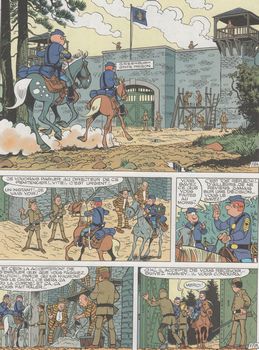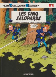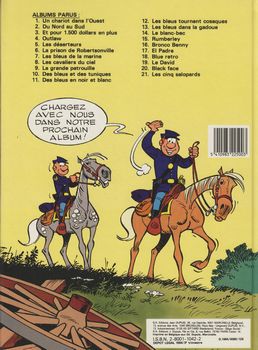 remarques: | premier album cartonné de la série, les pages de garde sont maintenant illustrées par le sergent Chesterfield et le caporal Blutch, le 4ème plat change et ces deux illustrations resteront la norme pour les prochains albums Blutch et Chesterfield partent en mission pour recruter de nouveaux cavaliers pour le 22ème de cavalerie >> p. 5 la charge de cavalerie de 17.00 à 19.30 heures avec trois cavaliers >> p. 8 l'arrivée à Frogtown >> p. 10 l'incitation au patriotisme n'a pas autant de succès que la prime à l'engagement >> p. 13 la récolte des signatures les deux amis ne trouvent pas beaucoup de recrues jusqu'à ce qu'ils tombent sur les condamnés à mort du pénitencier de Greenbush qui acceptent de les suivre = les cinq salopards: Osgood le révérend, Shorty Fink voleur et hippophage (mangeur de chevaux), Yang le chinois karate-man ainsi que le duo Rupert et Abel, l'aveugle et son chaperon >> p. 31 l'aveugle qui vise bien au poignard finalement les cinq salopards ne donnant pas les résultats escomptés dans les rangs de l'armée de l'Union, le général Alexander préfère les démobiliser et les envoyer rejoindre les lignes sudistes pour s'y engager et y semer la pagaille >> p. 40+42 les colères du général Alexander >> p. 46 la signature des cinq salopards en fin d'album >> un récit tiré du film les 12 salopards (1967), un scénario acceptable et un graphisme appréciable avec un bon coloriage |