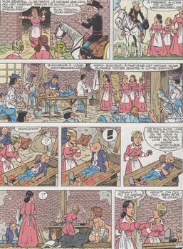 remarques: | toujours la guerre de Sécession, mais cette fois les femmes y sont bien représentées message du général Grant au général Alexander: tenir coûte que coûte les positions, mais celles-ci sont sévèrement bombardées par l'artillerie sudiste et les pertes nordistes deviennent élevées, Blutch est même pour une fois sévèrement blessé (on veut même amputer sa jambe) >> p. 6 de belles blessures que Blutch pourra montrer à ses enfants (Chesterfield dixit) Grant envoie alors à Alexander une troupe d'infirmières pour soigner les blessés et remonter le moral, mais la pagaille s'empare de l'armée, car tous les soldats s'annonçent blessés et veulent se faire soigner par les jolies infirmières (même le capitaine Stark veut se rendre à l'infirmerie) >> p. 13 Alexander ordonne alors à Burke, une brute de soldat, de se déguiser en une grosse et laide infirmière, ce sera miss Bertha qui sera chargée de débusquer les tirs-au-flanc >> p. 18 Arabesque, la jument de Blutch est une vraie mère pour Blutch et pour quitter l'armée, Blutch imagine de tomber amoureux de miss Jenny, une jeune et triste infirmière, il demande alors une permission pour le mariage (Blutch et la belle ont l'intention d'en profiter pour déserter), alors que le capitaine Stark demande miss Bertha en mariage >> p. 32 les préparatifs du mariage Burke démissionne et Alexander ordonne à Chesterfield de devenir miss Bertha >> p. 36 la nouvelle miss Bertha, alias miss Cornélie toutefois la ruse de Blutch est éventée, Alexander décharge miss Cornélie qui part à la poursuite des deux pseudo-mariés qui sont rattrapés, mais comme Blutch a réussi à prévenir Alexander d'une offensive sudiste, il est récompensé et admis comme infirmière dans l'armée avec miss Jenny, sa pseudo-mariée, tout cela bien sûr au détriment du caporal Blutch >> un récit tout à fait convenable et qui apporte un peu de fraîcheur à cette putain de guerre qui elle ne fait vraiment pas dans la dentelle |
