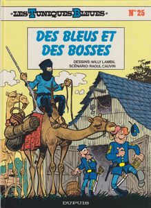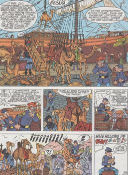 remarques: | 25ème album de la série, 24 titres au verso un convoi de munition en route pour le front subit de grandes difficultées d'acheminement suite aux intempéries et à la boue qui s'accumule sous les roues des chariots le capitaine Stilman propose d'effectuer les transports par dos de chameaux qui sont des animaux très résistants le lieutenant Lovelace, Blutch et Chesterfield sont chargés de réceptionner des dromadaires (à New York?) avec leur convoyeur le dénommé Ahmed >> p. 12/13 l'arrivée du bateau des ivrognes (car l'équipage a dû passer sa soif avec de l'alcool, les chameaux ayant bu toute l'eau disponible) l'avantages des chameaux sur les mules ou chevaux: endurance, sobriété et grande capacité de chargement, mais aussi des désavantages: mauvaise odeur, sale caractère et marche particulière des dromadaires appelés les vaisseaux du désert >> p. 16 de plus les chevaux n'aiment pas les dromadaires >> p. 21 par contre, les dromadaires trouvent le sergent Chesterfield très sympathique >> p. 33 le cavalier capitaine Stark qui n'adresse jamais la parole à un fantassin finalement l'expérience avec les dromadaires est suspendue et ce seront les sudistes qui les récupéreront provisoirement à leur avantage, mais Blutch et Chesterfield réussiront à convaincre Ahmed de quitter les sudistes et à retourner dans le désert (américain cette fois) >> p. 46 la remarque de Chesterfield: si on m'avait dit que j'aurais le coeur fendu en contemplant des fesses de dromadaires s'estompant dans les brumes de l'aube, je ne l'aurais jamais cru >> peut'être intéressante sur le terrain, l'expérience des dromadaires n'est pas une grande réussite dans l'album, le manque d'imagination se fait quelque peu sentir et la série commence à battre de l'aile et de la bosse, en fait avec ce no 25 ce sera le début de la fin pour la série tant pour le scénario que pour le graphisme |