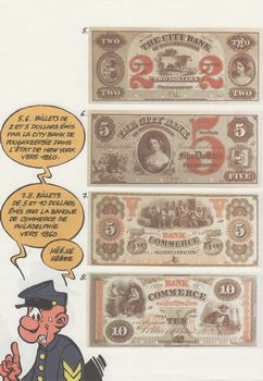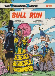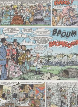 remarques: | l'album contient une feuille documentaire à découper sur les billets de banque en circulation durant la guerre de Sécession, ce qui augmente la côte de l'album si cet ex libris est présent (voir annexe) l'histoire de la fameuse bataille de Bull Run où même les civils sont sensés assister et participer à la victoire programmée mais manquée de l'Union à Richmond (= cri de guerre des nordistes) ce fut la honte de toutes les batailles des fédérés >> p. 7 la parade de l'armée nordiste les civils suivent l'offensive nordiste et alors que la victoire de l'Union est presque certaine, les sudistes recoivent d'importants renforts qui renversent la situation, c'est maintenant Washington au lieu de Richmond qui est menacée, mais grâce à Blutch qui réussit à faire sauter le pont conduisant à Washington, les sudistes seront arrêtés dans leur avance >> p. 16 la guerre comme spectacle >> p. 23 Blutch en garçon de café sur le champ de bataille >> p. 39 la blessure suspecte de Chesterfield >> un album riche en couleur, mais pas très convaincant, malgré tout assez intéressant également pour le texte annexes - couverture de l'album - ex libris - extrait de page - nord contre sud Information - la première bataille de Bull Run, aussi nommée première bataille de Manassas par les forces sudistes (ce nom est encore fréquemment employé dans les États du Sud), fut le premier affrontement majeur de la guerre de Sécession entre l'Union (Nord) et la Confédération (Sud) - la bataille se déroula le 21 juillet 1861 près de la petite ville de Manassas, en Virginie, à 60 km au sud-ouest de Washington, alors qu'elles sont persuadées d'obtenir une victoire facile, les forces nordistes, non aguerries, sous les ordres du brigadier général Irvin McDowell traversent la rivière Bull Run pour affronter l'armée sudiste guère plus aguerrie sous les ordres des généraux Joseph E. Johnston et Pierre Gustave Toutant de Beauregard - malgré un engagement de la bataille qui leur est d'abord favorable, les forces nordistes subissent un échec cuisant et, mises en déroute, doivent se replier sur Washington |
