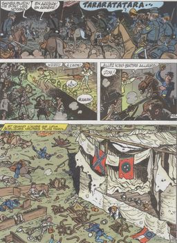 remarques: | le moral est au plus bas chez les Fédérés >> p. 6 la ruse du déserteur Blutch ne passe plus inaperçue aux yeux du sergent Chesterfield >> p. 10 le général Alexander cherche des distractions pour ses troupes tout en considérant que son armée doit rester un bastion de la morale >> p. 12 crever les yeux du rossignol pour le faire chanter n.b. certains oiseleurs, par un raffinement barbare, crèvent les yeux à un rossignol pour rendre sa voix plus harmonieuse >> p. 14 les choeurs de l'armée bleue Blutch et d'autres déserteurs sont choisis pour former une troupe théâtrale, mais pour ce premier acte, la pièce est trop triste >> p. 19 arrivée de l'artiste Raphaël de Saint-Sulpice qui lance une représentation du Cid de Corneille, mais cette fois la pièce est maintenant trop monotone et selon le général Alexander fait bailler aux corneilles nouvelle arrivée avec l'artiste pédé Zizi Asphodèle, le danseur-étoile (une chochotte amoureuse) >> p. 37 une démonstration de danse par Zizi >> p. 45 grâce à la combination Raphaël/Zizi, le vrai spectacle aura quand même lieu toutefois les deux comédiens seront faits prisonniers des sudistes, mais y trouveront malgré tout leur compte >> un récit un peu spécial sur le théâtre à l'armée, toutefois malgré l'extravagance du scénario, le développement de la trâme n'est pas des plus réussi même avec des tuniques bleues danseuses |
