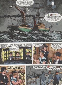 remarques: | épisode de guerre de Sécession sur mer Chesterfield et Blutch sont mis en jugement pour avoir fuit devant l'ennemi et pour éviter la peine capitale, ils doivent accepter une mission spéciale consistant à empêcher un politicien du sud en route pour l'Europe à la recherche d'alliances et de soutien pour la cause sudiste n.b. opprobre = déshonneur à cet effet, ils embarquent sur la "Rose de Bantry", un navire irlandais où se trouve le politicien Hogan, Blutch est déguisé en croque-mort et Chesterfield en macchabée >> p. 10 le capitaine irlandais O'Connell la "Rose of Bantry" est pourchassé par un navire nordiste, mais réussit à s'échapper de nuit grâce à une lune cachée, notre duo se met à la recherche du passager sudiste Hogan >> p. 16 + 33 le beau navire "Rose of Bantry" >> p. 28 pour survivre, Chesterfield, caché dans les cales du navire, doit manger du rat tout cru sur la "Rose of Bantry", l'équipage commence à croire au diable et la panique s'installe à bord, Hogan est localisé, mais Blutch et Chesterfield se font arrêter avant de pouvoir agir, ils sont abandonnés sur la mer dans une simple barque, toutefois recueillis plus tard par un navire nordiste quant au dénommé Hogan, il disparaîtra sans savoir ce qu'il est advenu de lui dans le récit >> un récit pas trop mal élaboré avec un petit zest d'énigme policière, mais un texte un peu pauvre à l'eau de rose de Bantry, des macchabées qui fichent les chocottes et une mission inachevée |