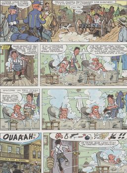 remarques: | un épisode interlude hors la guerre de Sécession Blutch et Chesterfield envoyés à Bloomington près de Salt Lake city chez les Mormons pour faire appliquer la loi Morrill interdisant la polygamie par la même occasion, connaissance avec la famille Grumbler: le père et ses 4 fainéants de fils, des bons-à-rien (Andy, Waldo, Roy et Elliott) >> p. 7 l'épisode de l'eau chaude qui résurgit à travers tout l'album >> p. 10/11 et 18/19 la différence marquée entre Mormons et Grumbler (surtout pour la culture en propre et en figuré) >> p. 12 brève mention de Brigham, le futur chef de l'église mormone >> p. 18 la poule qui s'est suicidée grâce à Blutch, Grumbler père reprend les choses en main (page 33), alors que Chesterfield décide de devenir un mormon (page 27) et apprend maintenant à traire les vaches (page 28) >> p. 29 l'apprentissage de la traite des vaches mais la dernière tentative de Blutch pour ramener Chesterfield à la vie normale réussira grâce au souvenir d'Amélie Appeltown >> un album dédié aux Mormons qui ont la sympathie de Cauvin, vie de paix par opposition à la vie de violence dans l'armée lors de la guerre de Sécession (à laquelle un bataillon de Mormons aurait participé) graphisme et texte dans la moyenne inférieure, mais toujours encore intéressant, un assez bon Grumbler, grumble grumble... annexes - couverture de l'album - extrait de page - arrivée de Brigham Young en Utah (1847) Information 1/ la théologie du mormonisme est la doctrine de l'Église de Jésus-Christ des saints des derniers jours, nommée 'Évangile de Jésus-Christ', elle est fondée sur les Saintes Écritures et la révélation moderne par l'intermédiaire des prophètes - selon la doctrine, tous seront sauvés dans un royaume de gloire, mais pas tous dans le royaume céleste 2/ the Morrill Anti-Bigamy Act (37th United States Congress, Sess. 2., ch. 126, 12 Stat. 501) was a federal enactment of the United States Congress that was signed into law on July 8, 1862 by President Abraham Lincoln, sponsored by Justin Smith Morrill of Vermont - the act banned bigamy and limited church and non-profit ownership in any territory of the United States to $50,000, the act targeted the Mormon practice of plural marriage and the property dominance of The Church of Jesus Christ of Latter-day Saints in the Utah Territory - the measure had no funds allocated for enforcement, and Lincoln chose not to enforce this law, instead Lincoln gave Brigham Young tacit permission to ignore the Morrill Act in exchange for not becoming involved with the Civil War, general Patrick Edward Connor, commanding officer of the federal forces garrisoned at Fort Douglas, Utah beginning in 1862, was explicitly instructed not to confront the Mormons over this or any other issue 3/ Brigham Young (1801-1877) fut le successeur de Joseph Smith comme président de l'Église de Jésus-Christ des saints des derniers jours de 1847 à sa mort survenue en 1877, il fut également le premier gouverneur de l'État du Deseret, non reconnu par le gouvernement des États-Unis (1849-1851), puis du Territoire de l'Utah (territoire organisé, 1851-1858) et participa ainsi à la guerre de l'Utah - La guerre de l'Utah, aussi connue sous les noms d'expédition de l'Utah ou de bévue de Buchanan (Buchanan's Blunder), est un conflit qui a eu lieu dans le territoire de l'Utah entre les colons mormons et le gouvernement fédéral des États-Unis, la confrontation a duré de mars 1857 à juillet 1858, le conflit s'est achevé par l'effondrement de l'État du Deseret, dirigé par les mormons, au profit d'une administration américaine sur le territoire de l'Utah et à la reconnaissance par le gouvernement américain de l'Église de Jésus-Christ des saints des derniers jours et de son administration installée à Salt Lake City, capitale mormone - Brigham se convertit au mormonisme en 1832 et devint membre du collège des douze apôtres en 1835, lorsqu'il prit la présidence, il conduisit l'exode des pionniers mormons qui traversèrent, en chariots à bœufs ou en charrettes à bras, les plaines d'Amérique du Nord jusqu'à la vallée du lac Salé, où les premiers mormons arrivèrent en 1847 - Brigham Young est un personnage controversé, principalement en raison de ses enseignements sur la question noire, de doctrines jugées violentes (comme l'expiation par le sang) et de la mise en place de la polygamie en Utah |