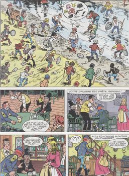 remarques: | épisode retro sur Blutch et Chesterfield >> p. 4 la ruse de Chesterfield pour arrêter Blutch dans ses tentatives de désertion en criant "chargez" à Arabesque qui se couche instantanément rencontre de Chesterfield avec Doc Harding, un doc ivrogne, qui lui raconte l'histoire de Blutch qu'il avait recueilli comme bébé >> p. 7 l'hôtel des three birches (trois bouleaux) >> p. 11 l'origine du nom de Blutch (blulb, blob, blutch) par la suite, Blutch fut retiré de la paternité de Doc Harding pour éviter de confondre lait et whisky, Blutch est confié à l'orphelinat de Silas Hancock (genre Oliver Twist et David Copperfield) par les dames patronnesses (= personne qui s'occupe des œuvres sociales et du patronage d'une paroisse, l'expression tend à devenir désuète et à désigner, de façon ironique, toute personne qui donne des leçons de morale) fuite de Blutch aidé par Doc et en route pour la prospection d'or en Californie >> p. 16 Blutch est déjà un jeune homme intelligent et sait se défendre arrivée à San Francisco où Blutch est affecté au minage des mines >> p. 26 tableau de San Francisco en 1860 >> p. 29 allusion au général Sutter? >> p. 30 la combine de mise à feu des mèches à explosif puis Doc et Blutch se séparent, brèves retrouvailles à Leavenworth (Pike's town) et ville-phare des chercheurs d'or, mais le duo se sépare à nouveau et Doc ne reverra plus Blutch par la suite jusqu'à la rencontre avec Chesterfield qui reconduit Blutch à l'armée après que celui-ci ait déserté (mais Chesterfield aura été une mère-poule pour Blutch) fin de l'album: à nouveau un épisode avec Arabesque >> excursion folklorique à travers les USA, racontée au fil de l'enfance de Blutch, album sans grande surprise, mais retour aux vertes années de Blutch, années pas mûres avec des larmes de joie et de tristesse |