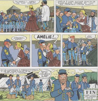 remarques: | épisode hors guerre de Sécession Blutch et Chesterfield accompagnent le capitaine Nepel chargé du commandement de Fort Bow durant la maladie du colonel Appeltown >> p. 6 une mission qui plaît à Chesterfield (parce qu'il reverra Amélie Appeltown) arrivée à Fort Bow où le capitaine Nepel assure l'ordre en chassant hors du fort les rouges, les jaunes et les noirs, enfin tous les métèques y compris Fleur-de-Lune, la domestique comanche d'Amélie Appeltown Blutch et Chesterfield essaient de calmer les guerriers de Cheval Fou, révoltés par ce nouveau traitement >> p. 21 la grande frayeur du colonel Appeltown encore malade >> p. 25 racisme également chez les comanches de Cheval Fou >> p. 28/29 le duel entre Chesterfield et Cheval Fou tout ce monde se retrouvera au fort (portes ouvertes et fermées) où le colonel Appeltown, remis de sa maladie, remet énergiquement de l'ordre dans la pagaille causée par le capitaine Nepel >> p. 46 Chesterfield recompensé par un baiser d'Amélie Appeltown >> un album sur le racisme (NEPEL = LEPEN), mais un des plus mauvais scénarios de la série et même le baiser d'Amélie à Cornelius n'y changera rien |