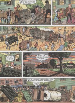 remarques: | à nouveau un épisode de la guerre de Sécession Kansas 1863, après un raid de la cavalerie de Quantrill le rénégat avec sa bande comprenant les deux frères James: Frank et Jessie, le sergent Chesterfield se fait passer pour un détrousseur de cadavres afin d'infiltrer la bande à Quantrill et de permettre à la cavalerie nordiste de localiser le refuge de Quantrill pour l'anéantir, Blutch faisant office d'intermédiaire entre Chesterfield et la cavalerie nordiste >> p. 8 le nouveau juron de Chesterfield: didji >> p. 14 le supplice de Blutch en tant que gardien >> p. 24 les belles et les bêtes, en l'occurence deux bambis qui assistent à la réunion des bandits >> aventures plutôt banales avec Môssieur Quantrill (un ancien instituteur) parsemées des apparitions burlesques de Blutch, des répartites douteuses de Chesterfield et où finalement Môssieur Quantrill sera le vrai héros de l'histoire en réussissant à tirer ses marrons du feu et à jouer un bon tour à la cavalerie nordiste au détriment bien sûr de Blutch et de Chesterfield qui seront à nouveau mutés dans la marine comme charbonnier-chauffeur >> un récit décevant, avec beaucoup d'onomatopées et un graphisme moyen de Lambil n.b. onomatopée = mot qui évoque par le son la chose dénommée (son ou cause d'un son) annexes - couverture de l'album - extrait de page - portrait de Quantrill - Quantrill's raiders in Texas: little Archie Clements, Dave Pool and Bill Hendricks Information - William Clarke Quantrill (1837-1865) est un hors-la-loi américain, chef de l'unité de combat de la guerre de Sécession responsable des plus importantes tueries visant délibérément des civils, en particulier le massacre de Lawrence, au Kansas - le 10 mai 1865, Quantrill et sa bande sont surpris dans une ferme à 50 kilomètres de Louisville, la plupart d'entre eux réussit à fuir, mais Quantrill, blessé d'une balle à la colonne vertébrale, est fait prisonnier, paralysé, il est emprisonné à Louisville où il meurt le 6 juin 1865 - Quantrill laisse en héritage une bonne partie de sa fortune illégale à sa maîtresse Kate King, celle-ci profite de cet héritage pour ouvrir une maison close, devenant ainsi une des personnalités les plus notoires des quartiers mal famés de Saint-Louis (Missouri) - Quantrill reste un personnage controversé, tantôt idéalisé pour l'efficacité de ses actions de guerillero, tantôt décrié pour les crimes commis sur des civils alors que sa mission était de détruire des unités nordistes et leur matériel en dehors des conventions classiques de la guerre |