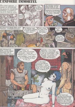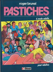 remarques: | on passe à une classe supérieure avec l'école adulte (mais en fait peu de différences de texte et d'image avec les éditions antérieures), les épisodes de cet album se référant surtout à la bande dessinée après-gardiste - les Coincés (by Bretécher), - les palpages d'Eugénie (by F'Murr)**, - Emphilémon sur le Q (by Fred), - Corbo Malbese (by Pratt), - Lucky ou rock en trans (by Margerin), - Jérémiaaah (by Hermann), - Poilarella (by Forest), - les 7 vits de l'épervers ou le masqueuerouge (by Juillard), n.b. vit = membre viril, pénis, verge - Triche devant (by Lauzier), - la Quequête de l'Oisel du Tendre (by Loisel/Le Tendre), - Adèle Cul-sec (by Tardi), - le passage est devant (by Bourgeon), - le vagabind des Lombes = Axel Monshit et Susky (by Ribera), - Lubriques en vrac (by Gotlib), - le temps des naufragés avec Clitoffert (by Gillon), - l'enfoiré immortel (by Bilal), - le Bédéclic (by Manara), - les Pinochod (by Binet)**, - l'Incul rose avec John Defoul (by Moebius/Jodorowsky), - Banane au goût du monde (by Vicomte), - Love Slurp (by Druillet)**, - le Dougag (by Dimitri), - Laupette (by Pichard), - le grand Pinuche (by Cabu), - Thanajo (by Cosey) - le comte Fantax (by Crepax) >> une autre fournée de pastiches, toujours dans la même lignée n.b. restent quand même quelques auteurs sur la planche à pain (seront en partie mentionnés dans les prochains albums) tels que: - Adamov, Aidans, Alexis, Amblevert, Arno, Auclair, Azara, - Bielsa, Blanc-Dumont, Boilet, Bonnet, Bonvi, Boucq, Breccia, Brocal, Buzzeli, - Caza, Ceppi, Cestac, Chaillet, Charles, Chott, Clerc, Craenhals, - Dethorey, Ersel, Faure, Ferrandez, Ferry, Floc'h, Forton, Franz, Funcken, - Giffey, Gigi, Hardy, Hulet, Le Rallic, Leo, Liquois, - Mandryka, Marini, Martial, Maréchal, Mitteï, Montellier, Mitton, - Parras, Pellos, Pinchon, Poïvet, Ramaïoli, Redondo, Reding, Rouge, Ruffieux, - Sanahujas, Schetter, Schuiten, Trubert, - Vance, Veyron, Yslaire et autres et surtout surtout le grand Rosinski, mais enfin tout ce beau monde de BD ne pouvait pas participer au grand Pastiche-Théâtre de Brunel |