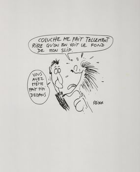 remarques: | les histoires de Coluche racontées et illustrées par Reiser pour les restos du coeur 1) préface par Wolinski des illustrations de Reiser comme des coups de griffe et un Coluche constamment drôle = une bête de scène 2) quelques bonnes histoires dont - la prostituée - la chouette (sujet pas très clair) - le moribond - le réfugié - la superstition - la jolie petite juive et le vilain nègre - les histoires de juifs - le cochon (= la meilleure histoire) >> des histoires comiques, cyniques et satiriques sur la société, sur la politique, la religion et l'économie empreintes de racisme et de sexe, il y en a des mûres et des pas mûres, mais surtout un graphisme spécial de Reiser avec un bon coloriage n.b. exemplaire représentatif des oeuvres de Reiser dont la bibliographe comme suit: Jean-Marc Reiser né en 1956 mort en 1983 du cancer, participe au lancement de Hara-Kiri, Charlie Hebdo, Charlie Mensuel, l'Echo des Savanes sans oublier le magazine écologiste "la Gueule ouverte", puis Reiser intègre l'équipe de Pilote et travaillera aussi pour la presse d'information (Le Monde, Le Nouvel Observateur), ses oeuvres principales: - ca va être ta fête - les copines - dessins cochons - l'écologie - la famille Oboulot en vacances - fous d'amour - gros dégueulasse - Jeanine - mon papa - on vit une époque formidable - phantasmes - la saison des amours - tam-tam - la vie au grand air - la vie des bêtes - vive les femmes - vive les vacances - - y en aura pour tout le monde |