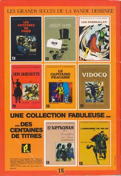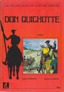 remarques: | album broché 48 pages N&B, texte sous image l'histoire du poète-fou Cardenio avec sa fiancée Lucinde, rencontre peu après avec la jeune femme Dorothée qui se fait passer auprès de Don Quichotte pour la princesse Micomicona pourchassée par un ogre géant, n'écoutant que son coeur, Don Quichotte se battra contre le géant, mais ce n'est qu'une grosse outre de vin dans laquelle Don Quichotte baignera dans son vin-sang retrouvailles de Lucinde avec Cardenio et de Dorothée avec Don Fernando, puis Don Quichotte a des ennuis avec les archers de la Santa Hermandad à cause de l'affaire des forçats, il veut se battre, mais le curé réussit à le convaincre de suivre ses enchanteurs (les archers) et Don Quichotte est mis en cage, néanmoins il sera libéré grâce à l'intervention du curé nouvelle altercation avec un cortège de pénitents qui portent la statue de la Vierge que don Quichotte prend pour une princesse prisonnière qu'il veut aussi libérer >> p. 88/89 autre altercation avec une troupe de comédiens-ambulants et finalement duel avec un autre chevalier errant rencontré sur son chemin: le chevalier aux Miroirs >> commentaires voir le tome 1 n.b. un troisième tome de Don Quichotte était annoncé mais n'a jamais paru |
