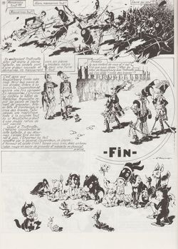remarques: | aventures de guerre napoléonienne avec le général en chef Coupendeux, le général Angoulafre, le général de division Tutupanpan à la jambe de bois, le général Gardavou et le fantassin Billentête à la tête de bois accompagnés de Mascotte et Trottinette, leurs mascottes; leurs ennemis: les généraux russes Bretzel et Cruchawodka décoré de l'ordre du taste-rhum et du général prussien Choucroutof les deux armées se font façe, l'armée de Bretzel s'est réfugiée à Kouglofbourg assiégé par Coupendeux, une trêve pour soigner les blessés est convenue >> p. 4/5 l'installation du poteau-frontière les hostilités reprennent et un combat à coups de canon s'engage pour la possession du pont de la Sucette, un boulet ennemi emporte la tête de l'artilleur français, mais le chirurgien parvient à lui confectionner une nouvelle tête avec du plomb dans le crâne >> p. 17 la nouvelle tête de l'artilleur, avec un canon de vin blanc pour le remettre d'aplomb Moustache réussit à détruire le canon ennemi et Angoulafre en éclaireur parvient à capturer le général Bretzel, l'ennemi effectue une sortie pour délivrer Bretzel, Trottinette est chargée de faire sauter le pont sur la Sucette, les combats se poursuivent en bateau sur la rivière et parfois même sous l'eau de la rivière >> p. 34 par la suite, faute de combattants, on commence à pêcher à la ligne on cherche alors à mettre à sec le lit de la rivière, Trottinette a l'idée de détourner la rivière depuis sa source, finalement l'assaut est donné et Kouglofbourg est enlevé >> une histoire enfantine, animalière, charmante, mais pas dénuée d'humour avec quelques jeux de mots intéressants, surtout toutefois avec un graphisme particulier et bien étudié |
