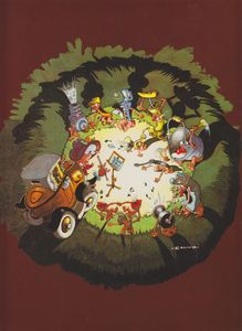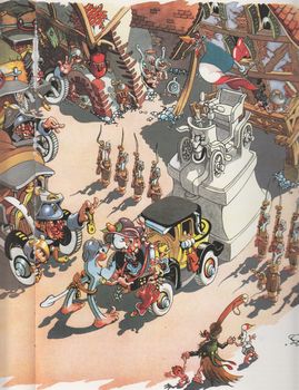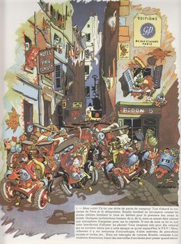 remarques: | réédition de l'album G.P. 1946, un des chefs-d'oeuvre de Calvo, une voiture et des objets humanisés, réédition 1978 par Futuropolis, 32 pages, texte sous et à côté de l'image 1/ préface de Pierre Lebedel les aventures de Rosalie parues en album chez G.P. en 1946, peu après la "bête est morte" (même présentation), les animaux sont maintenant ramplacés par la mécanique 2/ Calvo et Uderzo: le maître et l'élève Uderzo fait connaissance à l'âge de 14 ans avec Calvo, alors que celui-ci travaille pour Junior (1941); sur le plan de la qualité graphique dont le coloriage, Calvo était un maestro et de son vivant, il n'a pas eu le succès qu'il méritait >> n.b. à comparer: les forêts de Calvo et d'Uderzo 3/ Rosalie le vieux balai barbu qui avait bien connu Rosalie qui était née petite, mais n'avait jamais grandi, elle en avait beaucoup souffert et souvent aussi elle s'ennuyait >> p. 8 l'aventure avec le vieux camion militaire qui fait de la contrebande, ce qui conduit Rosalie au poste de police avec des voitures de mauvaise conduite! puis Rosalie est réquisitionnée lors de la guerre de 1914 avec les taxis parisiens >> p. 14 deux moteurs se prennent en grippe et sont sur le point de cogner alors que le pneu a des tuyaux intéressants sur l'ennemi >> p. 18 le tablier du pont détruit >> p. 20/21 la garde d'honneur pour l'exploit de Rosalie >> p. 22 une vis élégante qui s'était fait platiner la tête la fête organisée en l'honneur de Rosalie >> p. 25 les tournevis éméchés qui tentent de se mettre en vrille avec salade de bielles, malheureusement une bougie met le feu à un bidon d'essence, ce qui cause un incendie qui est toutefois éteint grâce à une caisse de champagne explosif et le feu grisé ne sait plus où donner de la flamme, tout est bien qui finit bien mais on avait eu chaud >> un magnifique volume dans la veine de "la bête est morte" et "anatomie atomique", le texte est bien élaboré, souvent moralisateur, mais plein d'humour et avec de savants jeux de mots mécaniques et surtout à nouveau un splendide graphisme et coloriage annexes - 1er et 4ème plat de l'album - la traversée de Paris - le jour de la cérémonie pour Rosalie |