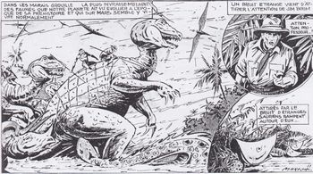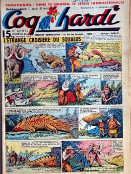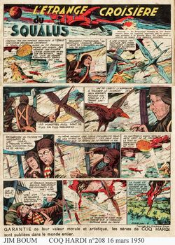 remarques: | broché, N&B, 21 pages, dessinées par Marijac sauf les 4 dernières pages dessinées par Mathelot, série parue dans Coq Hardi de février à juin 1950 Jim Boum et le prof Satanas projettent une expédition vers la planète Mars avec l'avion-fusée "Squalus" qui ressemble à un squale après un voyage relativement court, nos deux compères arrivent sur Mars, planète qui ressemble beaucoup à la Terre du temps préhistorique >> p. 6 la terre vue dans le rétroviseur de la fusée >> p. 8 les flammes de l'échappement du Squalus qui mettent le feu aux gaz de la queue d'une comète nos amis trouvent sur Mars une planète en pleine évolution peuplée de monstres préhistoriques et d'hommes-singes à l'âge de la pierre, heureusement ils sont toujours équipés de leurs fameuses grenades à gaz, mitraillettes, etc >> p. 13 le serpent ailé le prof Satanas blessé et une éruption volcanique se déclanchant sur Mars, Jim Boum, sur les instructions du prof Satanas, réussit à remettre en marche le "Squalus" et à rejoindre la Terre, mais le prof. Satanas mourra durant le voyage du retour >> le récit reprend quelque peu celui du "chasseur de monstres", toutefois le graphisme est un peu mieux élaboré (dommage à nouveau pour la reproduction en noir&blanc alors que les illustrations étaient en couleur dans Coq Hardi) |