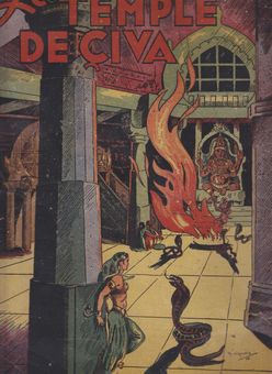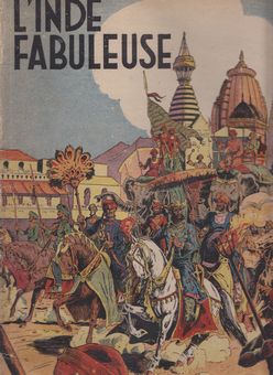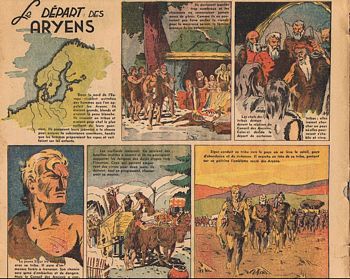 remarques: | - album grand format, 1943, 32 pages, comprend une fresque centrale (panorama) "de l'Océan à l'Himalaya" sur double page et souvent manquante; - ce cahier aurait été conçu avec la collaboration de Josse pour le graphisme et de Jacqueline Lamy pour le scénario, page de garde: la carte des Indes n.b. c'est l'unique album édité par le périodique pro-nazi Le Téméraire 1/ le départ des Aryens - une race d'hommes grands et blonds à la peau blanche qui vivaient dans le nord de l'Europe, menacée de famine, une tribu décide d'émigrer, - le jeune Sigur en prend le commandement et dirige son peuple vers l'est (le soleil levant) >> p. 2 l'emblème sacré des Aryens (la croix gammée) - après avoir affronté plusieurs dangers, la horde atteint la Mer Noire, le grand désert salé d'Iran et enfin la fertile vallée de l'Indus où ils s'établissent - ils auront encore à combattre des sauvages petits hommes noirs, mort de Sigur, son fils Wilbur le remplace à la tête de la tribu 2/ Sita et le roi des démons - l'histoire des Aryens qui conquirent les Indes comme racontée dans le Ramayana (livre semblable à la bible) ou l'histoire du roi Rama = fils d'un rajah hindou, - Rama et son épouse Sita doivent fuir la colère d'un usurpateur, Sita se fait enlever par un roi-démon, Rama part sur l'île de Ceylon pour délivrer sa femme après avoir fait alliance avec les singes contre le roi-démon 3/ les castes - les indo-aryens se multiplient en de nombreuses tribus, Varuna est dieu de la justice, Indra dieu du soleil et Brahma est le dieu suprême, les prêtres de Brahma forment la caste des brahmanes = caste supérieure, puis vient la caste des ksatriyas = rois et guerriers, la caste des vaicyas = commerçant, artisans et paysans et enfin la caste des çudras ou intouchables, une caste complètement à l'écart des autres 4/ décadence - en se mélangeant aux indigènes, les indo-aryens deviennent des hindous, c'était une dégénérescence pour les indo-aryens; n.b. en français, il fut un temps où les habitants de l'Inde étaient appelés Hindous; l'appellation Indien était alors réservée aux Indiens d'Amérique (ou Amérindiens) - cet usage d'Hindou est aujourd'hui désuet, et Indien est l'appellation qui s'est répandue au XXème siècle pour désigner les habitants de l'Inde, l'hindou n’est autre qu’un pratiquant de l’hindouisme apparition de deux nouveaux dieux: Civa, dieu de la mort et des démons = dieu destructeur et Vichnou = dieu protecteur >> p. 9 l'histoire du déluge selon la religion hindoue 5/ Boudha - en 500 BC, fils d'un grand roi, Cakyamuni se rend compte de la misère et de la souffrance humaine; il quitte sa vie de richesse pour une vie humble d'ascète et cherche dans la solitude la suprême sagesse - il connait alors la révélation et s'appelle désormais Boudha = l'illuminé = celui qui sait 6/ la légende de Boudha - croyance de la métempsychose (passage des âmes ou réincarnation) - le roi des cerfs réincarné en un éléphant blanc et son sacrifice à son tour est réincarné en un roi sage et plein de bonté qui sera réincarné en le personnage de Boudha 7/ l'empereur Açoka - le grand empereur qui refusa la guerre et apporta la prospérité à son pays 8/ de l'Océan à l'Himalaya - panorama de l'Inde à l'époque d'Açoka (250 BC) 9/ contes des Indes - les Indes = pays des contes (semblables à ceux de La Fontaine) et tirés du livre "Hitopadeça": a) le mouton, le cheval, le singe et le crocodile b) les contes du vampire c) l'anneau de Sakountala 10/ Tamerlan - son ancêtre Gengis Khan avait submergé la Chine et la Russie (1154-1227), puis vers 1350 ce fut Tamerlan (du nom de Timour = l'homme de fer, mais quelque peu boiteux = Leng, on l'appela alors Timour-Leng = Tamerlan) - les mongols de Tamerlan saccagèrent les Indes en 1398, puis la Perse, l'Ukraine et la Turquie, mais Tamerlan meurt subitement en 1405 et les Indes retrouvent un peu plus tard leur splendeur d'antan 11/ Maucourt et Dupleix - à partir de 1600, les européens explorent les Indes et établissent des contacts commerciaux, surtout avec les épices, - le premier explorateur français fut Henry Maucourt >> p. 27 l'immolation des maharanées (= épouses des maharadjas) - Joseph-François Dupleix fut toutefois en 1742 le conquérant français des Indes avec la fondation de Chandernagor (l'actuel Calcutta) et de Pondichéry - il eut à combattre avec La Bourdonnais les anglais qui s'intéressaient particulièrement aux Indes, mais Dupleix fut injustement rappelé en France et celle-ci dût peu après abandonner aux anglais en 1761 toutes ses possessions aux Indes, - deux ans plus tard Dupleix mourait à Paris dans la misère la plus complète 12/ les cipayes - domination de l'Angleterre après la défaite de Tipoo-Saheb, sultan de Mysore - les cipayes = troupes indigènes commandées par des officiers anglais; en 1857 révolte des cipayes qui est réprimée durement par les anglais alliés aux Sikhs - les principales peuplades hindoues n'arrivant pas à s'entendre entre eux, ce qui faisait le jeu des anglais, la répression fut cruelle, un hindou exécuté par cheveu d'anglais tué! 13/ présent et avenir - en 1943, la promesse d'indépendance des Indes n'avait toujours pas été respectée par les anglais qui utilisaient la tactique "diviser pour règner" en entretenant la discorde entre brahmanistes et mahométans dont les religions s'opposaient sans que les anglais n'interviennent vraiment dans leurs querelles >> p. 32 l'Aga Khan, l'homme le plus riche du monde, sultan du nord-ouest de l'Inde - famine aux Indes avec des hindous en plus ravagés par les méfaits de l'opium dont les anglais avaient le monopole - résistance passive du mahatma Gandhi (= la grande âme) - on se demande en 1943 quelle sera l'avenir de l'Inde? 14/ page de documentation sur les Indes (1943) - 9x la superficie de la France, env. 400 mio d'habitants dont 60 mio de mahométans, premier pr