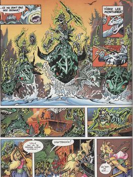 remarques: | au village de Tolden, Randin trouve un bébé, abandonné dans son écurie, c'est une fille mais elle est défigurée, elle est néanmoins adoptée par son épouse Telsi qui lui pose un masque sur le visage entretemps Marlysa grandit, mais porte toujours un masque, elle et d'autres enfants sont attaqués dans un bois par une bande de lods; durant ce combat Marlysa prouve déjà sa valeur comme guerrière >> p. 11 l'attaque des lods >> p. 13 les valmaks = des chevaux amphibiens plusieurs années plus tard, le trio Marlysa, Cilia et Tatrin se rendent à la Fondation de Dompour pour s'y entraîner (= un genre de service militaire) >> p. 23 l'attaque du voltak >> p. 25 où l'on parle du dangereux océan des brumes >> p. 29 l'apparition sublime de Marlysa au bal de la Fondation mais déjà un mystérieux danger guette Marlysa et lors de la dernière épreuve de la Fondation, leur équipe est agressée par des monstres flamboyants, nos amis s'en sortent mais il y a de nombreuses pertes ses parents disparus, Marlysa avec Cilia et Tatrin partent à leur recherche, nouvelle attaque des lods qui enlèvent Cilia, le xian Stirius se joint à eux pour aller délivrer Cilia, celle-ci est récupérée, mais c'était un piège pour éliminer Marlysa qui échappe à ce nouveau danger qui toutefois subsiste toujours fin du tome 1, Marlysa est à la recherche de ses origines, mais on ne connaîtra pas encore le secret qui se cache derrière son masque >> exemple typique d'heroïc-fantasy, genre Lanfeust de Troy pour lequel Danard a d'ailleurs en partie participé au graphisme; assez bon début et bon graphisme, mais rien de particulier, seul le tome 1 est collectionné ici à titre d'échantillon représentatif, il y aura toutefois encore plusieurs albums de publiés dans la série: - tome 2 1999 l'ombre de Dompour - tome 3 2000 l'autre côté - tome 4 2002 Bragal - tome 5 2003 le thaumaturge - tome 6 2005 la femme-vie - tome 7 2006 le waltras épisode 1 - tome 8 2008 le waltras épisode 2 - tome 9 2009 retour à Tolden - tome 10 2010 Tatrin de Tolden - tome 11 2011 la métamorphose - tome 12 2012 l'ordre noir - tome 13 2013 majesté - tome 14 2015 soeurs de sang - tome 15 2016 la cité des Rinults - tome 16 2017 l'emprise - tome 17 2018 le crépuscule du masque - tome 18 2020 renaissance - tome 19 2023 la malédiction de Mirdrane et aussi un tome 0 2008 la jeunesse |