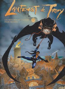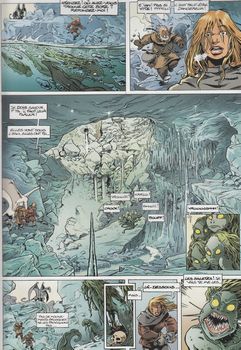 remarques: | titre complet: les pétaures se cachent pour mourir tome 7, octobre 1999 Eckmül est toujours sous le joug de Thanos Averroes, les érudits sont sous les verrous et la magie interdite; un mystérieux vengeur "l'ombre ténébreuse" avec son dragon noir Tornado et son fouet Polpedo (le zorro ou le batman de Troy) se révolte contre la dictature de Thanos l'haruspice représentant de la résistance passive d'Eckmül, Karaxabull, propose une alliance avec l'ombre ténébreuse, entretemps, Thanos est toujours à la recherche de Lanfeust dans le pays des glaces, rencontre de C'Ian et de Nicolède, eux aussi à la recherche de Lanfeust et Hebus disparus dans l'eau glacée avec les sirènes cannibales qui avaient déjà commençé à dévorer les corps en hypothermie de Lanfeust et d'Hébus la grotte où ils sont retrouvés est en fait une entrée pour la cité des glaces mais Thanos a aussi repéré nos amis et Sphax le dragon parvient à le lancer sur une fausse piste >> p. 10 le mot de passe pour la cité des glaces: la voie surgit de la soie déchirée et grâce à C'Ian, les deux morts-vivants sont vite rétablis >> p. 13 Hebus peut même déjeûner avec sa propre chair "je chuis délichieux" >> p. 14 la cité des glaces construite par les Anoïtes, mais il n'y a personne à Castel Or-Azur en reconstruction, le chevalier-baron décide de partir à la recherche de sa dulcinée C'Ian, il sera guidé par l'amour >> p. 21 le guide Glöof pour trouver le magohamoth sort de son oeuf (petite référence au film alien) sur leur trajet, nos amis rencontrent, à la frontière de la steppe froide des Marches Levantines, un caravansérail >> p. 26 la foire de la rivière gelée nos amis se joignent à la caravane qui est attaquée par les chapardeurs des marais >> p. 38/39 rivalité entre C'Ian et Falordelle, la fille du chef de la caravane et le duel des deux femmes qui se disputent Lanfeust >> p. 41 la mutation du Glöof en une sorte d'Incal et la migration continue, on arrive ainsi au cimetière des pétaures (= un genre cimetière des éléphants), retrouvailles avec le chevalier-baron qui se joint à nos amis avec son écuyer "Créfieu" à Eckmül, l'ombre ténébreuse tombe dans un piège tendu par Thanos et a bien du mal à s'en sortir mais par la suite, elle réussit à faire évader les érudits emprisonnés à Eckmül l'ombre ténébreuse se dévoile, c'est Cixi (mais c'est bien sûr) et cette fois Thanos lui sera à nouveau aux fesses, mais d'une autre manière >> un album tout à fait honorable dans la suite des évènements avec quelques nouveaux rebondissements et surtout toujours un bon graphisme |