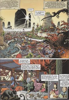 remarques: | tome 5, octobre 1997 Lanfeust à Eckmül, grâce à son épée à pommeau d'ivoire de Magohamoth, a comblé de présents C'Ian et Cixi >> p. 5 un texte de Brel et le jeu de la main de fer en attendant, Lanfeust et Hebus s'ennuient et mettent de l'animation à la fête de Cixi avec démonstration du pouvoir absolu tandis que l'haruspice prédit un avenir sombre pour Eckmül; Lanfeust se fait attirer dans un duel où il lui est interdit d'utiliser son épée magique, mais c'est un piège et durant le duel, une créature de Thanos lui dérobe son épée magique >> p. 9 Sphax le dragon blanc créé par Lanfeust pour Cixi entretemps le baron Averroes alias Thanos avec l'épée volée possède maintenant le pouvoir absolu et qui, après avoir conquis toutes les baronnies d'Hédolie, marche avec son armée sur Eckmül; apparition subite de Thanos qui veut aussi s'emparer de l'amulette d'ivoire de Magohamoth, il échoue dans sa tentative, mais le vénérable Lignole y perd la vie et maintenant pour vaincre Thanos, Lanfeust doit impérativement trouver le Magohomath, la quête continue >> p. 22/23 l'assaut sur Eckmül par l'armée de Thanos Lanfeust et ses amis s'enfuient sur un dragon volant en direction des mangroves de Questie >> p. 26 à 31 bataille aérienne entre dragons de Lanfeust et dragons de Thanos, heureusement Lanfeust chevauche Sphax qui démontre ses talents cachés, toutefois le dragon de Nicolède est blessé et l'équipe doit se poser sur le phare de Sikhet, point central de la mer du Ponant, il y sont accueillis par le soupirant de Cixi, l'ambassadeur Fëh-Rëhr (qui veut dire auroch d'or) et pour atteindre le Magohomath = la source de la magie, il faut traverser les montagnes du Darshan pour rejoindre le domaine des dieux qui savent comment rejoindre le Magohomath, le créateur des dieux, en procurant des guides, leur chef est le maître des dieux >> p. 35 clair de trois lunes sur la mer Ponant arrivée à Xingdu, capitale du Darshan où l'empereur Zedong confie à Lanfeust une mission spéciale à effectuer auprès des dieux >> p. 41 Xingdu, ville commerçante, où l'on trouve de tout, même des tresses de poils pubiens de vierges >> p. 45 Lanfeust en profite pour se confectionner une nouvelle épée personnelle >> p. 49 les dieux de Darshan dont le dangereux Swoög, dieu des trolls, le départ de l'expédition est imminent, mais auparavant Hebus doit dompter un troll blanc très sauvage et Lanfeust doit encore subir l'épreuve de l'ordalie >> p. 50 à 53 maintenant l'expédition est prête à partir avec Lanfeust, Nicolède, C'Ian, Hebus et Sphax mais sans Cixi qui s'est brouillée avec ses amis >> toujours encore intéressant, mais le charme du début n'opère plus aussi bien, graphisme un peu relâché et texte sans grande originalité, toutefois encore assez intéressant avec une jolie couverture d'album |