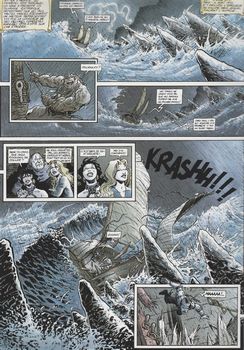 remarques: | octobre 1996, deuxième édition à Eckmül, la puanteur dégagée par le cadavre du pétaure est intolérable alors que le bateau emportant Lanfeust et ses amis approche des baronnies mais Thanos se téléporte sur le navire et essaie de s'en emparer, combats à bord >> p. 8 il fallait pas louper l'Hebus dixit Hebus la tentative de Thanos échoue et il s'enfuit en se téléportant, mais une tempête surgit et le navire s'échoue sur les récifs de la côte des 77 baronnies d'Hédulie >> p. 16/17 combat contre les crabes géants C'Ian est gravement blessée et ne peut se guérir elle-même >> p. 22 le système social des baronnies (quelque peu similaire à notre monde moderne) on arrive avec peine dans un village miséreux et C'Ian est amenée chez Rognar le rebouteux du coin pour y être soignée >> p. 24 le traitement médical infligé à C'Ian par Rognar C'Ian rétablie, l'équipe se dirige vers le castel Or-Azur pour y retrouver le chevalier à l'épée >> p. 30 agressé par les soldats du baron Averroes, Hebus fait le ménage, gottferdom! >> p. 32 arrivée au castel Or-Azur, assiégé par les troupes du baron Sixte-Averroes, celui-ci est équipé d'arkgues d'assaut = genre d'araignées géantes qui peuvent grimper le long des murailles en emportant quelques soldats sur leur dos nos amis arrivent à entrer secrètement dans le castel, mais le chevalier n'est pas là, c'est son père qui dirige la défense du castel, Lanfeust et Hebus se joignent aux défenseurs tandis que Nicolède consulte les archives du château cherchant une information sur le magohamoth >> p. 37 le baron Sixte-Averroes dans son armure >> p. 42 la recette du port-au-feu pour Hebus l'assaut sur Or-Azur se déclanche, de l'huile bouillante est jetée sur les arkgues mais c'est la pisse de Hebus qui fait le plus de dégâts, néanmoins l'ennemi est trop nombreux et Lanfeust et ses amis doivent s'échapper par vol delta, toutefois l'apparition d'un monstre gigantesque oblige Lanfeust à livrer un dernier combat contre le baron Sixte-Averroes qui tombe dans les mâchoires du monstre, c'en est finit du baron conquérant (mais il ressuscitera) et nos amis peuvent maintenant partir pour le tournoi de Culhaig où se trouve le fils du baron Or-Azur >> p. 52/53 la créature monstrueuse du Loch >> tout comme Thanos l'incongru, ce tome 3 est aussi quelque peu incongru, mais reste intéressant tant pour le texte que surtout pour le graphisme |