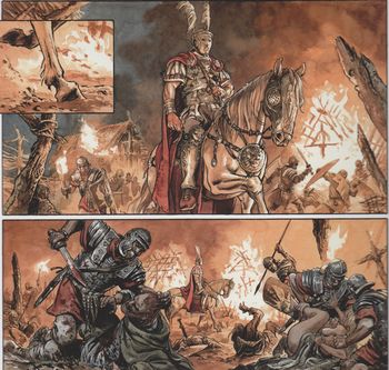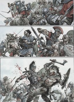 remarques: | première édition, novembre 2013, 58 pages avec glossaire en fin d'album - Germania 9 AC, une milice de légionnaires romains, dirigée par le cavalier au masque d'argent = Lepidus surnommé Furor Romanus, massacrent un village germain; entretemps, Marcus a échappé à Loknar et ses loups, celui-ci donne l'assaut sur le castellum, mais ses hommes sont repoussés, toutefois le castellum est encerclé et assiégé sans que Marcus puisse aviser Varus de la trahison d'Arminius, il envoie toutefois 4 messagers durant la nuit à travers les lignes des germains >> p. 18 les messagers envoyés par Marcus sont de retour, tandis que Varus en présence d'Arminius exerce sa propre justice à Castrum Visurgis >> p. 23 la crucifixion d'un chef germain - la révolte gronde parmi les troupes auxiliaires d'Arminius, mais celui-ci sait être patient, tandis que Lepidus achève l'éducation de son fils Quintus Titus et par la même occasion celle de sa femme Priscilla - rencontre du petit Quintus avec Arminius, Quintus lui explique qu'il déteste son père Lepidus, Arminius lui propose de poignarder Lepidus durant son sommeil afin que Quintus puisse devenir un loup, quant à Arminius il part enlever Thusnelda, fille de Segeste - au castellum assiégé, Marcus organise une diversion pour s'échapper avec un groupe de cavaliers >> p. 32 l'arme offensive des romains: le pilum mais Marcus échoue et est capturé par les hommes de Loknar, tandis qu'Arminius de son côté s'efforçe d'unir les tribus germaines contre Rome >> p. 39 la réunion des tribus devant Tyr, dieu de la guerre Cattuvar, un chef germain, s'oppose à Arminius pour le commandement et ce sera le jugement des dieux >> p, 43-46 le duel entre Arminius et Cattuvar (n.b. ce sera vite réglé par Arminius) - alors que Cabar, l'esclave noir de Morphea, réussit à délivrer Marcus qui s'empresse d'avertir Varus s'apprêtant à quitter son camp fortifié avec ses 3 légions pour établir ses quartiers d'hiver à Castra Vetera, mais ni Marcus ni Segeste venu soutenir Marcus ne sont pris au sérieux par Varus et c'est Marcus qui est arrêté pour trahison, Segeste est renvoyé dans son village - c'est Arminius qui triomphe sur toute la ligne tant chez les romains que chez les germains tandis que le petit Quintus se prépare à égorger Lepidus son père durant une nuit noire - Roma, une louve t'a donné la vie, un loup te la reprendra >> un 4ème album dans la lignée de la série; dans ce récit, on tourne beaucoup autour du chaudron des sorcières pour faire durer le plaisir et les têtes tombent à une cadence effrénée, le développement du scénario reste classique sans grande surprise, mais à nouveau un superbe graphisme y compris pour le coloriage n.b. contrairement aux albums précédents, il n'est pas annoncé un prochain titre à la fin de l'album, toutefois il devrait y avoir au moins encore un 5ème volume pour achever ce premier cycle, en fait il devrait y en avoir au moins six annexes - 1er et 4ème plat de l'album - deux détails de planches - couverture de la réédition en N&B |