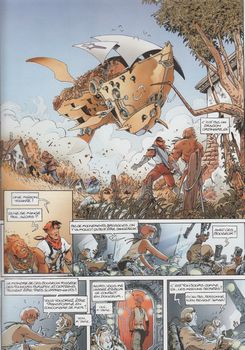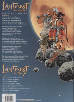 remarques: | début du 2ème cycle de Lanfeust de Troy Meirrion, la planète marchande prend contact avec Troy où Lanfeust et Hebus s'ennuient >> p. 8 le navire spatial de Meirrion arrive sur Troy, il est commandé par la jolie astronaute Glace, arrivé à Eckmühl, Glace explique l'origine de Troy aux sages de la ville dont Nicolède Troy appartient aux princes-marchands de Meirrion qui ont voulu effectuer une expérience de magie à l'aide du catalyseur Magohamoth, deux spécimens ont été maintenant sélectionnés pour continuer l'expérience: Lanfeust et Thanos, ils sont emmenés vers les étoiles, mais Glace est obligée d'accepter aussi Hebus qui ne quitte plus Lanfeust Glace durant le voyage supprime temporairement les pouvoirs magiques de Lanfeust et Thanos à l'aide d'une crypte tonique >> p. 20 découverte d'une passagère clandestine: Cixi en outre, de curieux militaires ont pris le navire de Meirrion en chasse et attaquée par ces pirates, la nef est endommagée et obligée de se poser sur une planète particulière: une antique station agricole, c'est maintenant une planète hostile peuplée de monstres provenant d'une population paysanne qui a dégénéré; nos amis sont capturés par les Blongos (= d'anciennes vaches à lait), durant leur captivité ils font connaissance d'un orgnobi, rare survivant d'une des plus anciennes races de la galaxie qui est adoré comme dieu protecteur sacré par les Blongos, ceux-ci reconnaissent que Glace et ses amis ne sont pas dangereux et les libèrent, toutefois Cixi a disparu et Lanfeust ne peut pas employer sa magie pour la retrouver, car Glace ne peut pas actuellement rétablir ses pouvoirs magiques, l'équipe part donc sans magie à la recherche de Cixi, enlevée par les Gondeys = des humains dégénérés à 4 pattes >> p. 39 le monstre Sitrween >> p. 41 la traversée de la forêt sanguinaire Cixi est découverte engluée dans un lac d'acide, c'est l'appareil digestif d'un végétal carnivore, après s'être débarrassé non sans peine de Sitrween = une plante carnivore créée par une aberration de l'ordinateur central de la station agricole, nos amis seront récupérés in extremis par un navire spatial de Meirrion, commandé par son altesse Dheluu >> à nouveau du pur heroïc-fantasy délirant entremêlé d'humour et de quelques jeux de mots, ce 2ème cycle continue dans la lignée du premier mais le charme du début n'opère plus autant que précédemment, même si le récit est amusant et agréable à la lecture avec un graphisme très respectable n.b. il y aura encore une suite de 7 albums (non collectionnés ici): tome 2 les tours de Meirrion (2003) tome 3 les sables d'Abraxar (2004) tome 4 les buveurs de mondes (2004) tome 5 la chevauchée des bactéries (2005) tome 6 le râle du flibustier (2006) tome 7 le secret des Dolphantes (2007) tome 8 le sang des comètes (2008) il y aura encore un troisième cycle édité par Hachette sous le titre Lanfeust Odyssey qui reprend l'intégrale de Lanfeust de Troy dès 2013 soit: - tome 17 l'énigme Or-Azur 1ère partie (2015) - tome 18 l'énigme Or-Azur, 2ème partie (2015) - tome 19 le banni d'Eckmül (2015) - tome 20 la grande traque (2016) - tome 21 le piège des sables (2016) - tome 22 le delta bilieux (2016) - tome 23 la méphitique armada (2016) sous le titre Cixi de Troy - tome 24 le secret de Cixi, 1ère partie (2014) - tome 25 le secret de Cixi, 2ème partie (2015) - tome 26 le secret de Cixi, 3ème partie (2015) sous le titre gnomes de Troy - tome 27 humour rural (2016) - tome 28 sales mômes (2016) - tome 29 même pas peur (2016) - tome 30 trop Meugnon (2016) sous le titre les conquérants de Troy - tome 31 exil à Port-Fleuri (2016) - tome 32 Eckmül le bûcheron (2016) - tome 33 la bataille de Port-Fleuri (2016) - tome 34 le mont Rapace (2016) sous le titre les guerrières de Troy - tome 35 Yquem le généreux (2015) - tome 36 l'or des profondeurs (2016) sous le titre Tykko des sables - tome 37 les chevaucheurs des vents (2016) - tome 38 la cité engloutie (2016) - tome 39 la colline des cent temples (2016) sous le titre Nuit safran - tome 40 Albumen l'Ethéré (2016) - tome 41 la vengeance d'Albumen (2016) la suite sans titre - tome 42 l'heure de la Gargouille (2016) - tome 43 voyage aux ombres (2016) - tome 44 l'expédition d'd'Alunys (2017) - tome 45 Ploneïs l'Incertain (2016) sous le titre Trolls de Troy - tome 46 histoires trolles (2014) - tome 47 le scalp du Vénérable (2014) - tome 48 comme un vol de Pétaures (2014) - tome 49 le feu occulte (2015) - tome 50 les maléfices de la thaumaturge (2015) - tome 51 trolls dans la brume (2015) - tome 52 plume de sage (2015) - tome 53 Rock'n troll attitude (2015) - tome 54 les prisonniers du Darshan (2015) - tome 55 les enragés du Darshan (2015) - tome 56 Trollympiades (2015) - tome 57 sang famille (2015) - tome 58 la guerre des gloutons (2015) - tome 59 l'histoire de Waha (2015) - tome 60 boules de poils (2016) - tome 61 poils de trolls (2016) - tome 62 la Trolle impromptue (2016) - tome 63 Pröfy Blues (2016) - tome 64 pas de Nöl pour le père Grommël (2016) - tome 65 l'héritage de Waha (2017) ( = dernier album annoncé) une liste interminable qui prend sa place dans les grandes séries de bande dessinée INFORMATION Lanfeust de Troy est une série de bandes dessinées écrite par Christophe Arleston et dessinée par Didier Tarquin elle est initialement publiée chez Soleil Productions entre 1994 et 2000, mais la série reprend en 2021 avec un 9ème tome: la forêt noiseuse c'est l'un des plus gros succès français du genre heroic fantasy et a grandement contribué à construire la notoriété de la maison d'édition Soleil créée par Mourad Boudjellal le cycle raconte les aventures de Lanfeust, un apprenti forgeron vivant dans le monde magique de Troy qui décide de partir pour une quête initiatique après avoir découvert qu'il avait un pouvoir hors du commun fort de son succès, le monde de Troy a été décliné