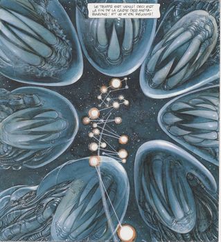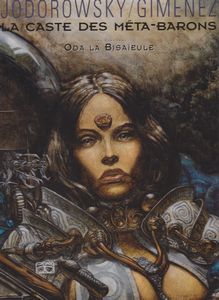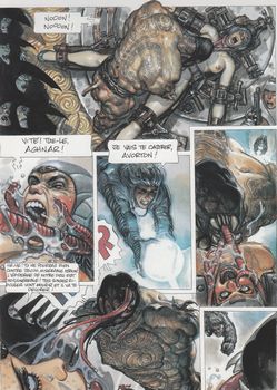 remarques: | édition originale, couleur, 68 pages - sur son vaisseau avec Oda comme pseudo-captive, Aghnar se dirige vers le repaire des prêtresses pour leur tendre un piège en utilisant Oda comme appât, à cet effet, grâce à son psychomimétisme, il se déguise en prêtresse pour pénétrer le repaire des nonnes-putes >> p. 11 le passage à travers les sondes-espionnes, les sondes génétiques, les sondes mentales et les sondes intra-inconscientes - Oda est remise aux révérendes-saintes qui la préparent pour recevoir les gènes du dieu Jejoh afin d'engendrer Sama-Wadj, l'avatar hermaphrodite qui détrônera Janus-Jaja l'emperoratriz hermaphrodite de l'Empire >> p. 14 à 17 le coït sacré avec le dieu-monstre Jejoh - finalement démasqué, Agharn arrive à la rescousse et détruit Jejoh l'indestructible, mais durant le combat, Aghnar perd son bras gauche, puis avec l'aide complémentaire de la force mentale d'Oda, les sorcières-putes sont également éliminées, toutefois l'effort psychique a été trop fort pour Oda qui tombe dans un coma mental (son cerveau commence à se vider) - reste encore à Aghnar d'affronter les cétacyborgs qui protègent le repaire des prêtresses tandis que les survivants des singes géants qui ont aidé Aghnar à combattre les prêtresses s'établissent sur la planète qu'ils renomment le monde diamante - Aghnar ne peut plus combattre seul les cétacyborgs et se résoud à se laisser mourir avec Oda >> p. 26 l'attaque des cétacyborgs - c'est alors qu'un puissant vaisseau spatial surgit du néant et détruit les cétacyborgs, le vaisseau est commandé par Honorata qui a échappé à la bombe des prêtresses dans son coeur en intercalant jusqu'à l'explosion une parenthèse dans le temps (une faille temporelle) et durant ce laps de temps, les robots d'Honorata cherchèrent et trouvèrent le moyen d'extirper la bombe micro H, puis Honorata construisit une machine de guerre capable d'abattre les cétacyborgs - Honorata déclare à Aghnar qu'elle peut ranimer Oda et rétablir sa force mentale, mais cela nécessite une énorme quantité psycho-chirurgicale de son énergie, ce qui provoquera sa propre mort, Aghnar doit donc choisir entre Oda et Honorata et avec tristesse Aghnar choisit Oda pour pouvoir perpétuer la race des Méta-Barons - Oda reprend alors conscience et Aghnar se confectionne un nouveau bras protonique, puis le couple procède à la fécondation qui résulte en l'accouchement d'un fils (qui sera nommé plus tard Tête d'Acier) - mais par la suite Agharn découvre qu'Oda était réellement morte, n'ayant pas pu être réanimée par Honorata et c'est celle-ci qui a pris la place d'Oda; s'en suit une dispute entre Agharn et Honorata durant laquelle Agharn décapite son fils, toutefois Agharn accepte que le corps du bébé soit greffé sur une machine: son corps peut vivre, il est sa chair et celle d'Oda, mais son esprit, fils de la dégénérescence d'Honorata devra être détruit et le bébé sera maintenu en vie jusqu'à sa taille adulte à l'âge où on pourra alors lui greffer une tête d'acier - jusqu'à cette période, Honorata devra préparer son enfant, car au jour dit Aghnar reviendra pour se mesurer à lui - entretemps, Aghnar redevient un guerrier implacable et un mercenaire qui loue ses services à celui qui le paiera le mieux et pour démontrer ses capacités, il combat et détruit la garde pourpre de l'emperoratriz >> p. 48 le couple impérial de la galaxie >> p. 53 à 56 les guerres ravagent alors la galaxie - un beau jour, les Pthagures achètent les services d'Aghnar pour mille millions de millions de kublars, ceci afin d'exterminer l'empire et sa galaxie; le couple impérial pour se défendre fait alors appel à un autre puissant mercenaire: ce seront Honorata et son fils Tête d'Acier, fils du Méta-Baron Aghnar et d'Honorata qui est en même temps sa mère et sa grand-mère >> p. 64-65 la démonstration de force de Tête d'Acier en créant l'arcane de la destruction: la fleur d'or, le défi avec son père commençait >> p. 59 le contrat avec les trois Pthagures (= clin d'oeil aux Shingouz dans les aventures de Valerian >> voir l'album l'ambassadeur des ombres) >> un album à nouveau super intéressant, mais cette fois le point limite de l'imagination de Jodorowsky est atteint, le développement de cette génération de Méta-Barons devient du délire et le graphisme de Gimenez est une orgie d'images et de couleurs, attention à la dérive! annexes - couverture de l'album - deux planches tirées de l'album |