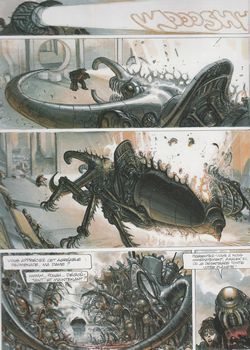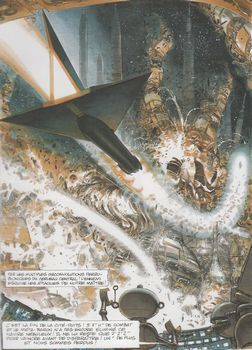 remarques: | édition originale, couleur, 64 pages - une attaque mystérieuse se déclanche sur le méta-bunker, le bio lectogramme n'arrive pas à arrêter l'envahisseur, l'opération porc-épic est déclanchée, mais c'est le Méta-baron du présent (ou son hologramme) qui est revenu pour détruire sa base et ses robots qui détiennent un secret sur le Méta-Baron que ses ennemis recherchent >> p. 8 le retour du Méta-Baron >> p. 15 la destruction du méta-bunker "adieu mes seuls amis" - mais les robots Tonto et Lothar ne veulent pas mourir et réussissent à effectuer un saut interspatial qui les transporte sur une planète barbare de la galaxie peuplée de monstres dinausoriens, malgré tout les deux robots commençent toutefois à construire un nouveau méta-bunker >> p. 16/17 les monstres monstrueux n.b. la suite du tome 5 ne reprend qu'à la page 18 - et pour contrer l'assaut des fanatiques troglosocialik-marxistes, Dona Vicenta de Rokha accepte d'épouser son père Don Nicanor, mais par ruse elle tente aussi de se détacher de son amour en s'arrachant les orbitres ophtalmiques (car hors des yeux hors du coeur) - par cette réaction, Don Nicanor retrouve la raison et reconnait sa fille, il accepte de la donner comme épouse à Tête d'Acier et de lui remettre la médaille de haute noblesse >> p. 23 la cérémonie de distinction tandis que de nouveaux yeux mentorobotiques sont greffés sur Dona Vicenta de Rokha >> p. 26 le paleo-mariage - mais les yeux mécaniques de Dona Vicenta de Rokha ne donnent après coup plus aucune satisfaction au guerrier-poète et dans son entité deux personnalités commençent à rivaliser: le guerrier et le poète; entretemps Dona Vicenta de Rokha est délaissée, mais elle porte déjà en son sein le germe d'un prochain Méta-Baron - un peu plus tard, arrivée sur Filodendra d'un technocardinal de la sainte technocause qui veut exploiter les riches gisements de Bikramen sur la planète pour la fabrication de la précieuse épyphite anti-gravitationnelle et les troglosocialiks sont priés de déménager vers un autre système planétaire; naturellement Don Nicanor refuse et le cuirassé de sa sainteté commence à détruire la capitale de Filodendra >> p. 36-39 la guerre éclate et les troglosocialiks sont écrasés - le Méta-Baron part en guerre mais pour redevenir guerrier à part entière, il détruit sa tête-poète et redevient Tête d'Acier >> p. 43 la mutation des techno-métamorphes >> p. 44 à 48 combats aériens entre la méta-nef et la gigantesque navette métamorphe - après avoir anéanti la nef ennemie, Tête d'Acier se rend au coeur du camp technopapal dans le technotemple du technopape Amalek XII, mais auparavant il lui faut encore combattre le gardien du technopape: >> p. 52 le technoscarabée finalement Tête d'Acier enlève le technopape et révèle à l'univers l'existence des gisements de Bikramen, ce qui déclanche >> p. 56/57 une ruée de paleohyènes qui s'entretuent pour cette nouvelle richesse - alors Tête d'Acier, tout comme son ancêtre Othon, négocie la vente du Bikramen contre un pourcentage sur le chiffre d'affaires et une nouvelle planète semblable à Filodendra >> p. 60 l'exode interplanétaire des troglosocialiks, mais sans leur chef Don Nicanor mort au combat - entretemps, Dona Vicenta de Rokha atteinte d'une tuberculose archaïque meurt après avoir mis au monde un futur Méta-Baron, mais ce sont des jumeaux: une fille et un garçon et uniquement un seul pourra survivre, lequel choisira Tête d'Acier? >> un techno-album qui ne dégage plus autant de techno-charme que les albums précédents, toutefois récit et graphisme sont toujours encore très méta-respectables annexes - couverture de l'album - deux planches tirées de l'album |
