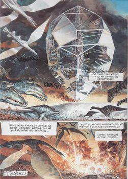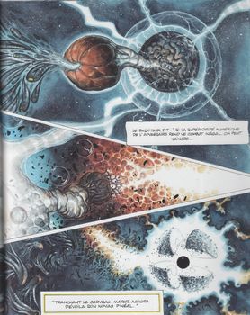 remarques: | édition originale, couleur, 64 pages >> p. 3 le nouveau méta-bunker - selon Tête d'Acier, dona Vicenta de Rokha s'est livrée à un suicide déguisé et celle-ci, malgré son nouveau-né, a maintenant perdu sa beauté, son amant, son château, sa planète, son peuple et son père et ne veut plus vivre, - le récit sur le secret du Méta-Baron actuel: sa cicatrice au sourcil qui lui aurait été affligée par Tête d'Acier - quant aux jumeaux, Tête d'Acier choisit, contrairement à la tradition, la fille pour survivre mais Tête d'Acier donne à ce corps de fille le cerveau du garçon; corps de femme, corps d'homme, elle s'appellera désormais Aghora, toutefois le corps du garçon sera conservé dans une niche anti-putréfaction et dona Vicenta de Rokha, mourante, est mise sous cape d'omnicryogelant qui gèle ses processus biologiques, Tête d'Acier voulant la garder en vie pour qu'elle puisse se rendre compte de l'évolution d'Aghora et comme nourrice, Aghora reçoit une tarentulouve >> p. 10 Deyanira, la tarentulouve qui deviendra la compagne fidèle et l'alliée d'Aghora - à 7 ans, Aghora subit le test de la douleur et reçoit une super-main gauche robotisée, son corps de femme devient un corps de guerrier avec des seins qui ne pousseront plus, toutefois le bas-ventre reste femme et sans tube érecto-rétractile, elle/il ne peut engendrer un nouveau Méta-Baron - première mission comme supermercenaire-bourreau: exterminer les condamnés à mort du bagne de Khaliyuga >> p. 14/15 quelques condamnations difficiles à exécuter - et à 16 ans, Aghora doit passer, en accord avec la tradition, l'épreuve d'initiation, mais Tête d'Acier est invulnérable et Aghora ne pourra le vaincre que par la ruse, car l'amour que Tête d'Acier voue à dona Vicenta de Rokha est le plus grand ennemi du guerrier et Aghora réussit à envelopper Tête d'Acier d'omnicryogelant et à le lancer dans le cosmos où il se perd dans l'espace infini - entretemps l'armada impériale est vaincue par de nouveaux envahisseurs dont les armes retrocèdent par réflection les attaques de leurs adversaires et cette fois Aghora n'est pas sollicitée par les forces impériales, car avec son corps de femme sans pénis, elle n'est pas reconnue comme suprême Méta-Baron - malgré tout après avoir éliminé ses adversaires (la lie de la cour impériale), Aghora est nommée par l'imperoratriz commandant des forces impériales et après s'être soi-même transformée par psycho-mimétisme en miroir réflectant, ce qui détruit à leur tour les vaisseaux des des envahisseurs, Aghora décide d'anéantir celui qui les contrôle >> p. 32/33 et tranchant le cerveau-mater, Aghora dévoile son noyau pinéal - le dernier duel contre son semblable (mais celui-ci n'a qu'un corps avec un esprit alors qu'Aghora a un esprit avec un corps) tournera à l'avantage d'Aghora et son adversaire vaincu, laisse derrière lui un univers où l'un après l'autre >> p. 37 explosaient d'innombrables galaxies >> p. 38 et devant l'imperoratriz, la cour impériale, les Mentreks, l'endogarde, la guilde techno-technos, le maganat, l'économat, la techno-papauté, les colonies troglosocialiks et l'armée, Aghora reçut la médaille plurigalactique, la plus haute distinction conférée par l'empire - c'est alors que l'impensable se produisit: Deyanira, atteinte d'une tumeur, est frappée de folie et pour abréger ses souffrances, Aghora décide de l'euthanasier et pour la première fois de sa vie, Aghora va laisser tomber une larme de la haine, Aghora découvre alors l'amour et veut engendrer un être plus humain que ses prédécesseurs, elle ou il extracte de sa tête d'homme des cellules mâles et les transforme après un traitement hypogénétique en tétars inséminateurs et se féconde lui-même dans son corps de femelle, ce fut le premier auto-inceste de l'histoire - puis Aghora prépara son accouchement dans la planète-jardin Flos, toutefois un danger survient: dans leur octochborg, quatre nonnes-putes survivantes de la secte Shabda-Oud (>> voir tome 4) se préparent à investir Kgen-Kgen, la prison de l'empire située sur l'abominable satellite de Titane pour délivrer la célèbre criminelle Zombra, afin que celle-ci grâce à ses pouvoirs spéciaux puisse aider la secte à s'emparer des commandes pour gouverner l'empire et supprimer l'imperoratriz >> p. 47 la fameuse Zombra - pour cela, il faut d'abord éliminer le gardien Méta-Baron qui est plus puissant que Zombra, toutefois Aghora est actuellement sur le point d'accoucher et donc plus faible et les nonnes-putes procurent à Zombra son kantyloptère qui lui redonne son pouvoir de dédoublement >> p. 51 elle devient une harpie qui peut se scinder en une fourmilière capable d'investir une planète entière pour ensuite une fois tout dévasté revenir à l'unité originelle, des millions de Zembra attaquent alors maintenant Aghora qui vient d'accoucher - et pour une fois Aghora doit prendre la fuite avec son Méta-bébé en inversant le pouvoir de son méta-glaive, elle se réfugie dans sa méta-nef alors que le Méta-bébé riait déjà intelligemment et avec son méta-canon maxi-oko, Aghora désintègre la planète Flos y compris toutes les Zombras qui s'y trouvaient; restait à éliminer ceux qui avaient ourdi le complot, au palais d'or les quatre nonnes-putes grâce à leur puissance mentale s'apprêtaient à éliminer l'imperoratriz, le Méta-Baron intervient à temps mais éprouvé par son accouchement et par sa lutte contre les Zombras, il ne parvient pas à détruire la révérende nonne-pute et ce ne sera qu'avec l'aide de la force mentale de son rejeton amené par le robot Tonto qu'Aghora restera vainqueur du combat >> p. 63 à l'héroïque rejeton du Méta-Baron, l'imperoratriz remet la médaille de l'archi-noblesse et le titre de Trino-Vicomte ainsi que trois millions de millions de kublars, le rejeton était devenu l'arme absolu et sera appelé Sans-Nom >> un formidabl